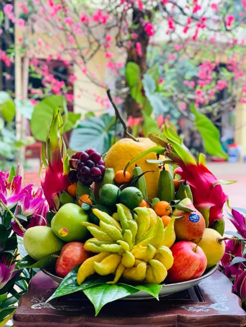 Mâm ngũ quả ngày Tết bằng nhiều loại quả đầy đủ màu sắc thể hiện mong ước về năm mới ngọt ngào, no đủ.