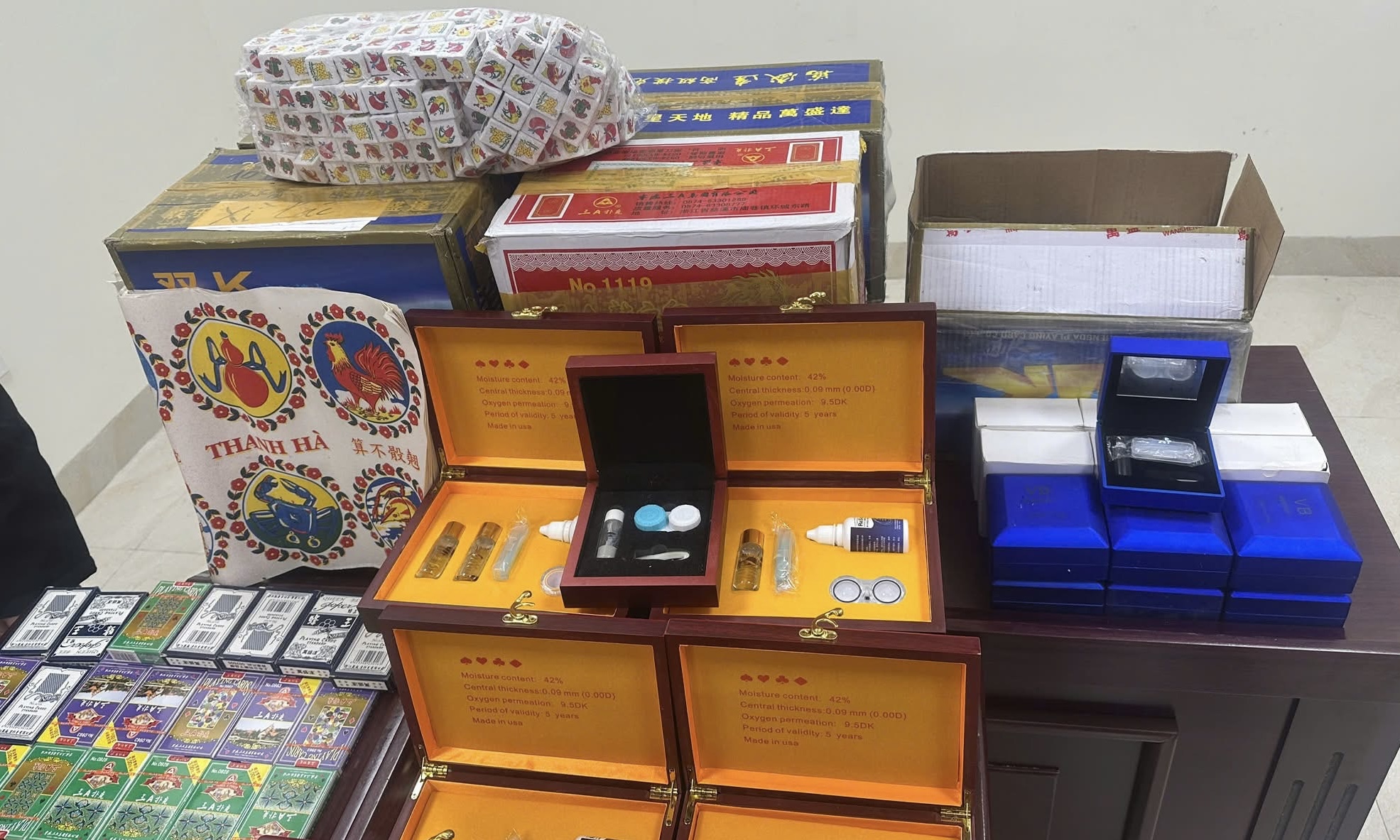 Tại địa điểm trên đường Hoàng Văn Thái, lực lượng chức năng phát hiện, tạm giữ 600 bộ bài tây chưa qua sử dụng, 50 hột bầu cua, 3 áo khoác dùng để giấu bài, 4 mũ lưỡi trai gắn thiết bị báo rung, 5 bộ kính áp tròng nhìn bài mã vạch...Tổng giá trị mua vào khoảng 20 triệu đồng, giá bán ra khoảng 30 triệu đồng.