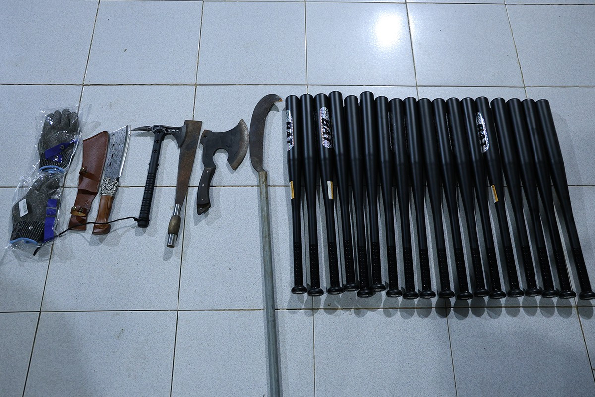 Công an thu giữ nhiều hung khí nguy hiểm. Ảnh: Tiến Tầm.