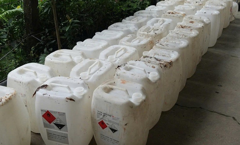 Can chứa axit axetic công nghiệp mà Lê Thị Lộc mua về để pha chế, sản xuất giấm giả.