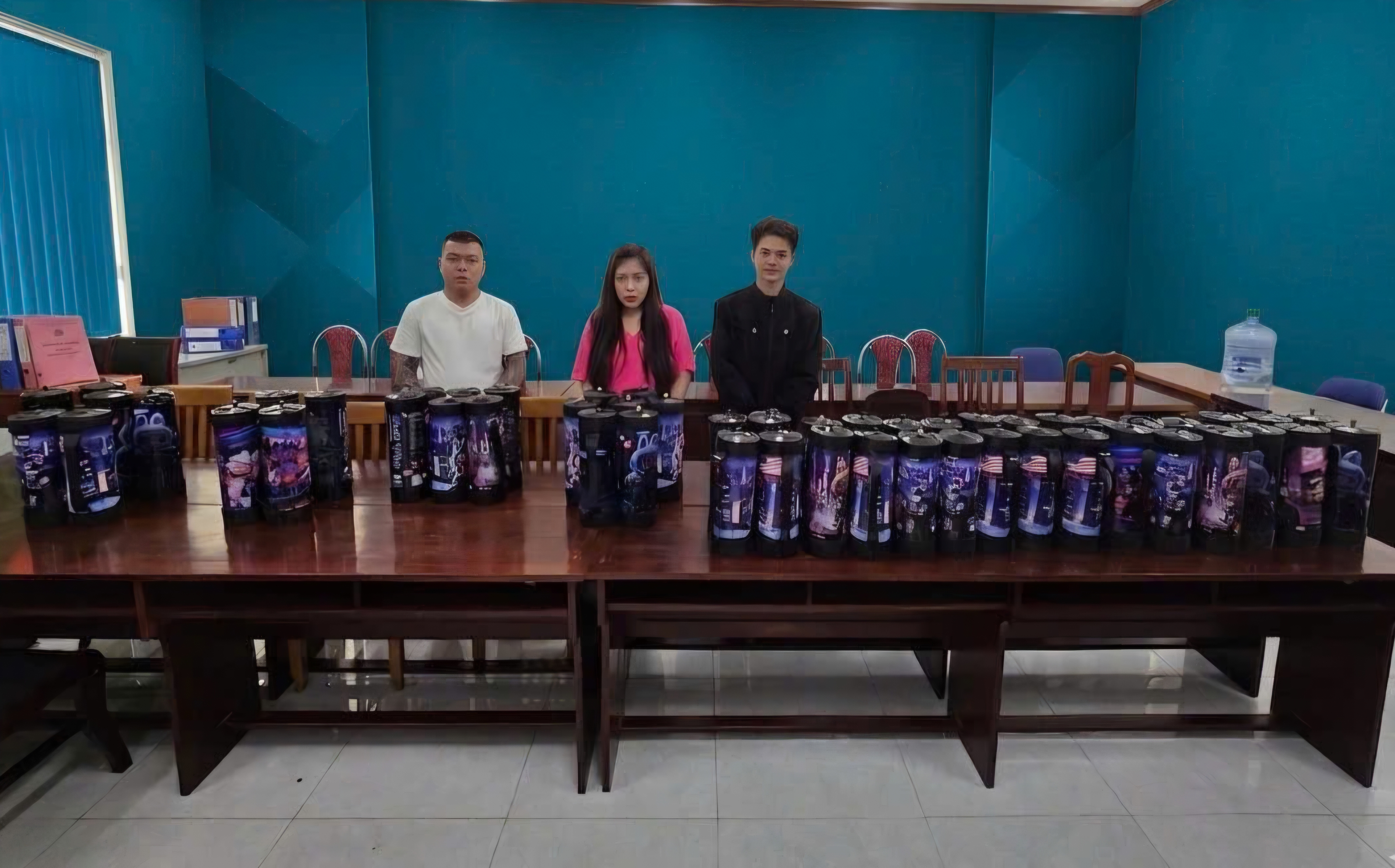 Tiến hành truy xét mở rộng, công an thu giữ tổng cộng 59 bình khí cười (tổng trọng lượng hơn 300kg).