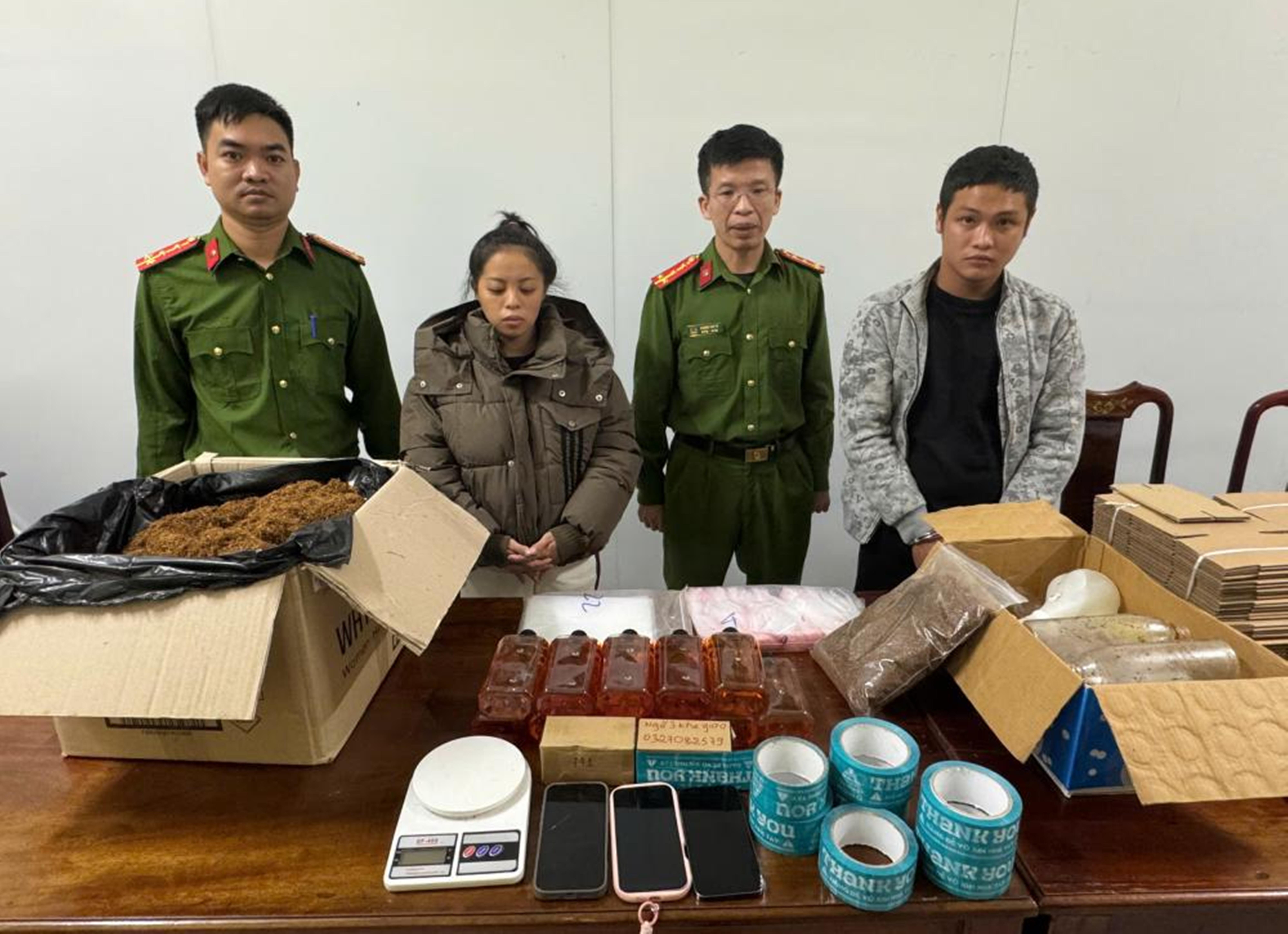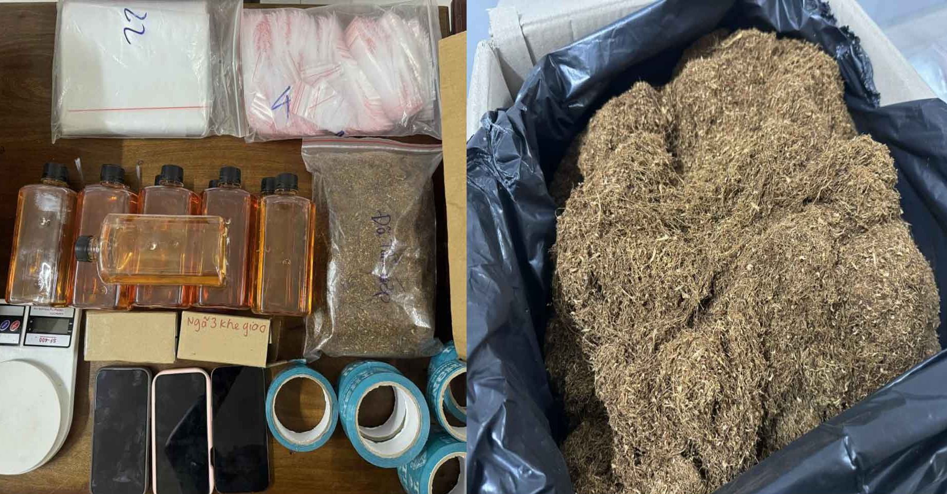 Khám xét khẩn cấp nơi ở của hai đối tượng, lực lượng công an thu giữ khoảng 1kg ma túy Tobaco thành phẩm, 9kg nguyên liệu thảo mộc khô, 11 chai (5 lít) dung dịch dùng để tẩm ướp, 200 hộp giấy để đóng gói ma túy, 6 cuộn băng dính, nhiều túi zip để chia nhỏ, 1 cân tiểu ly và nhiều tài liệu, vật chứng liên quan.