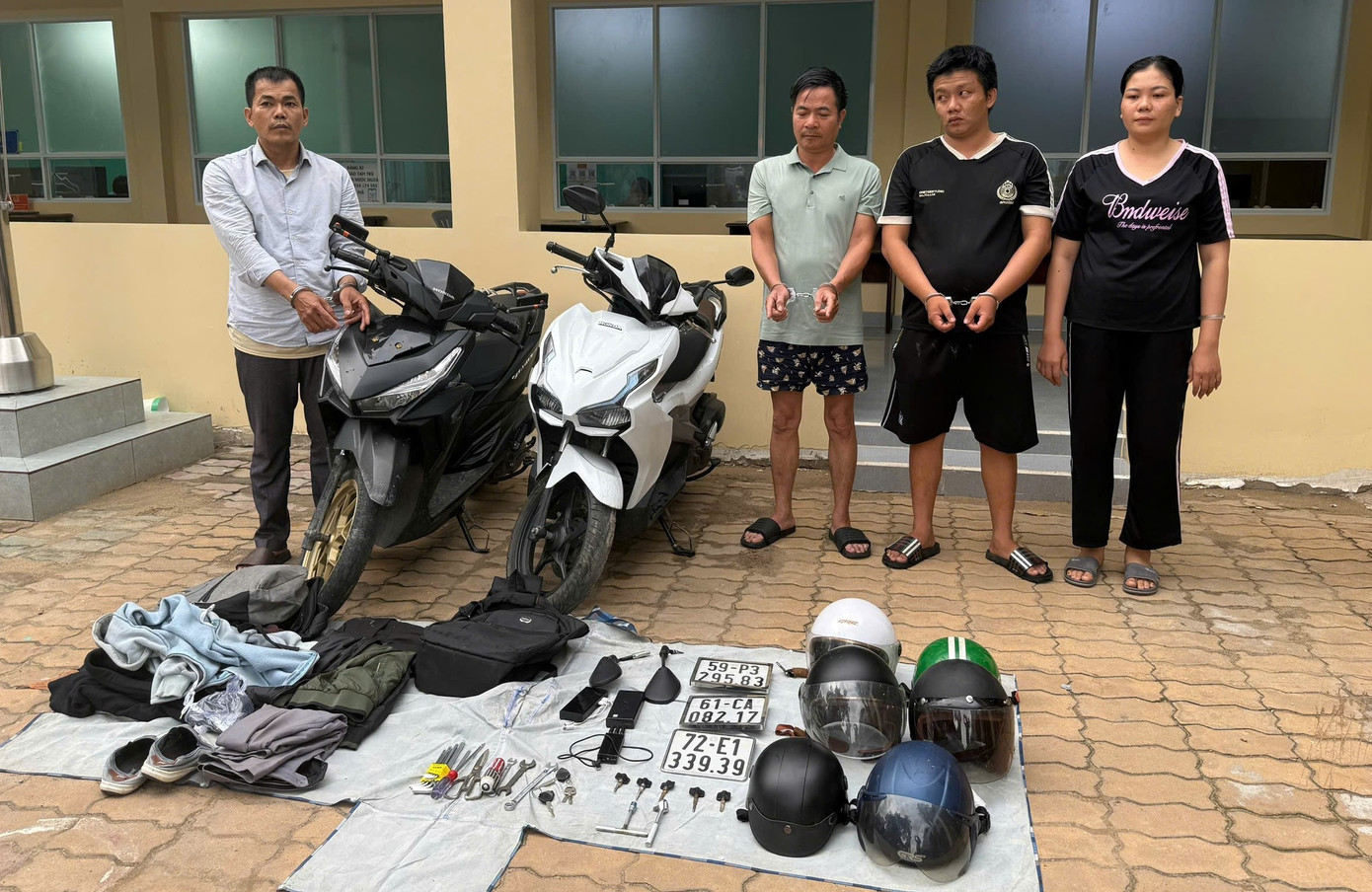 Khám xét nơi ở các đối tượng, công an thu giữ 5 xe máy, 6 điện thoại di động, nhiều đoản phá khóa, biển số giả và các tang vật liên quan khác.