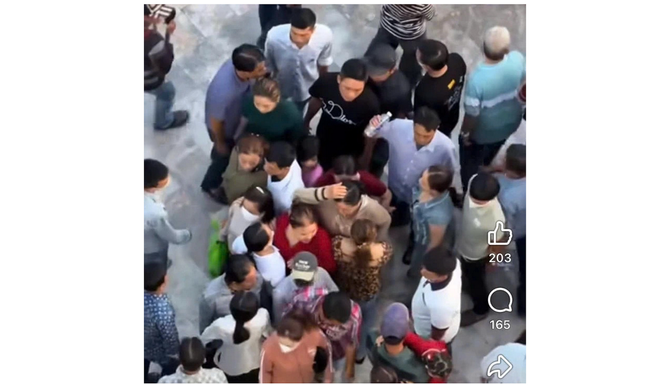 Theo nội dung đoạn clip, một nữ du khách mặc áo đỏ đang đứng trong khuôn viên khu Liên Hoa Bảo Tháp thì bị một nhóm khoảng 20 người tiến lại gần. Nhóm này vây vòng tròn, thu hẹp khoảng cách và tạo nên cảnh chen lấn, đông đúc, cuốn nữ du khách vào giữa.