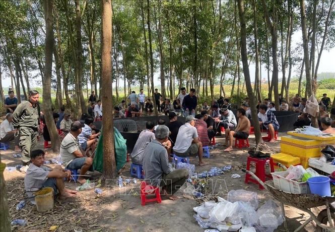 Các con bạc bị lực lượng chức năng tạm giữ tại tụ điểm đá gà thuộc khu phố Phước Hậu, phường Gò Dầu, tỉnh Tây Ninh. Ảnh: TTXVN phát