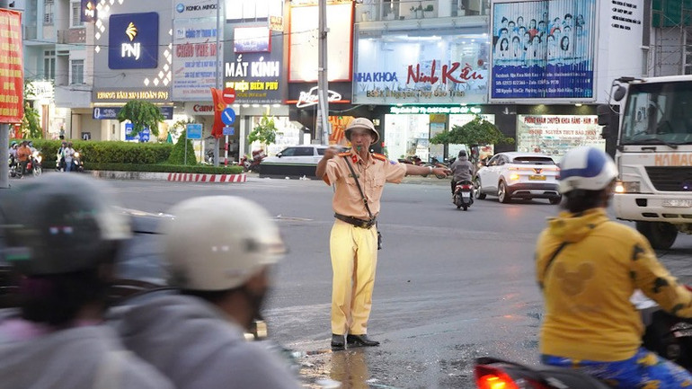 Công an Cần Thơ phân luồng, hỗ trợ người dân tránh các tuyến đường ngập.