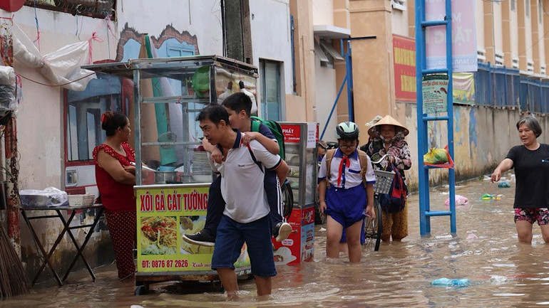 Nước ngập sâu, học sinh phải lội nước đến trường.