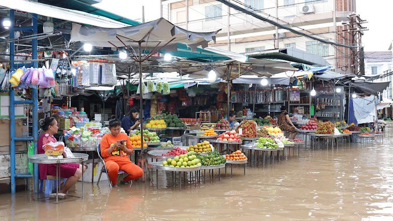 Nước ngập gây khó khăn cho việc kinh doanh của tiểu thương chợ Bình Thủy.