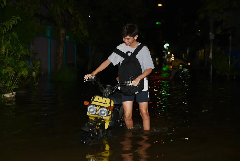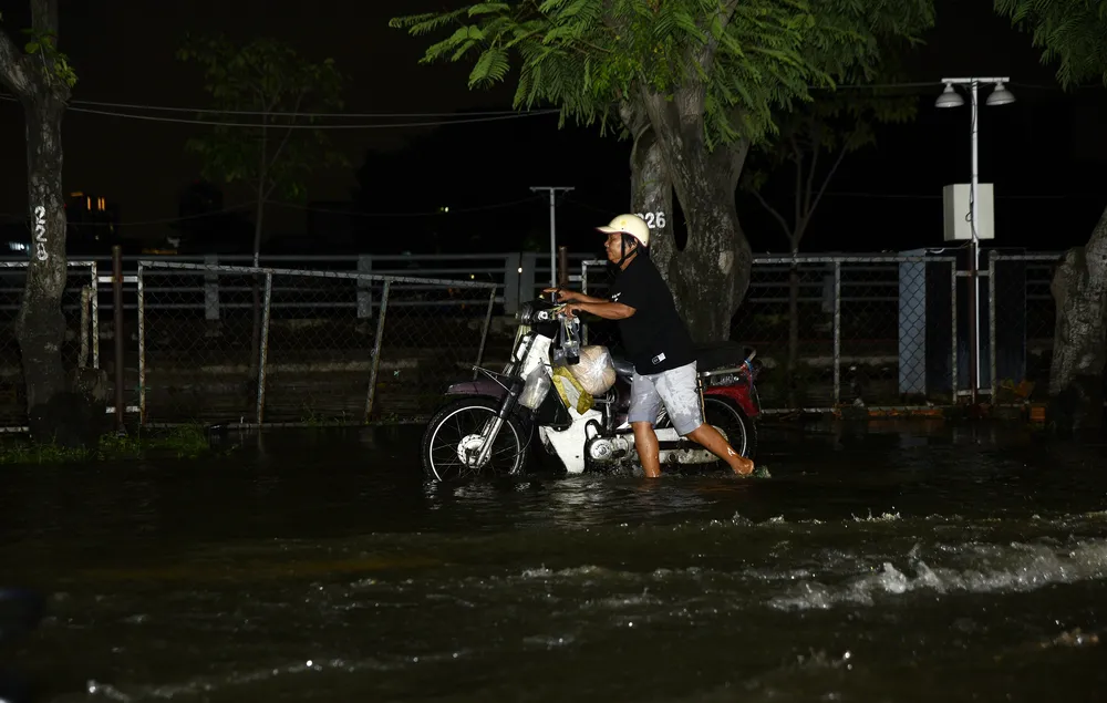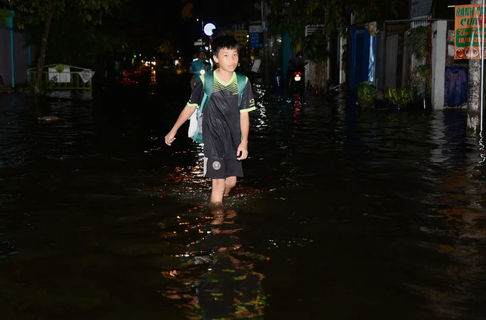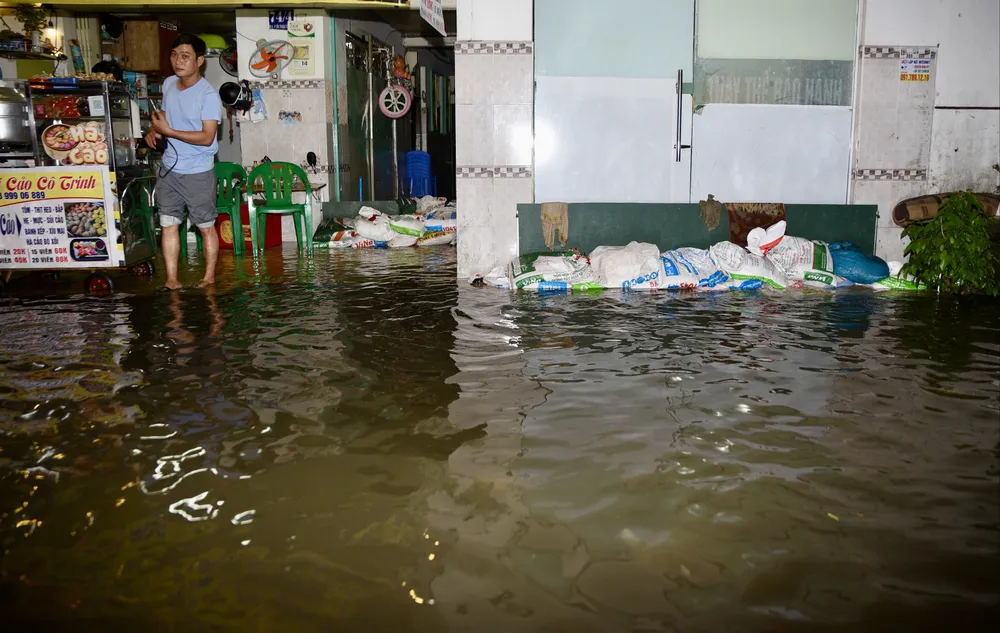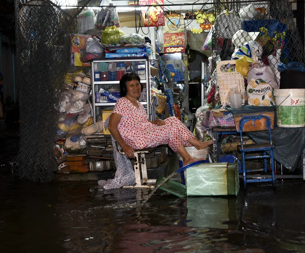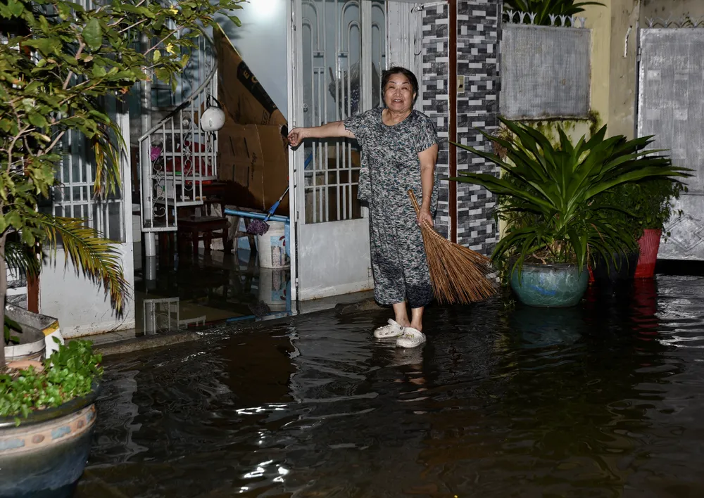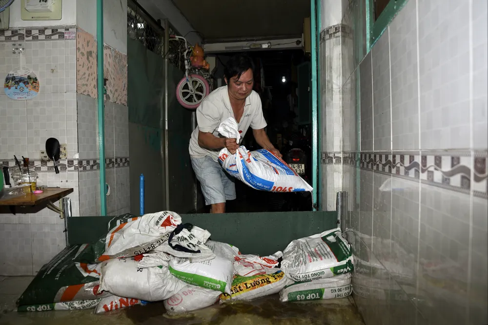 "Mấy ngày nay, triều cường dâng, nước ngập sâu quá. Tôi phải dùng bao cát đắp ngăn nước tràn vào nhà. Tình hình này chắc phải đến khuya nước mới rút sạch" - Anh Khánh, 43 tuổi, ngụ phường Tân Thuận, TP.HCM.