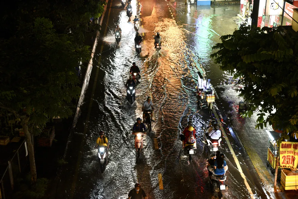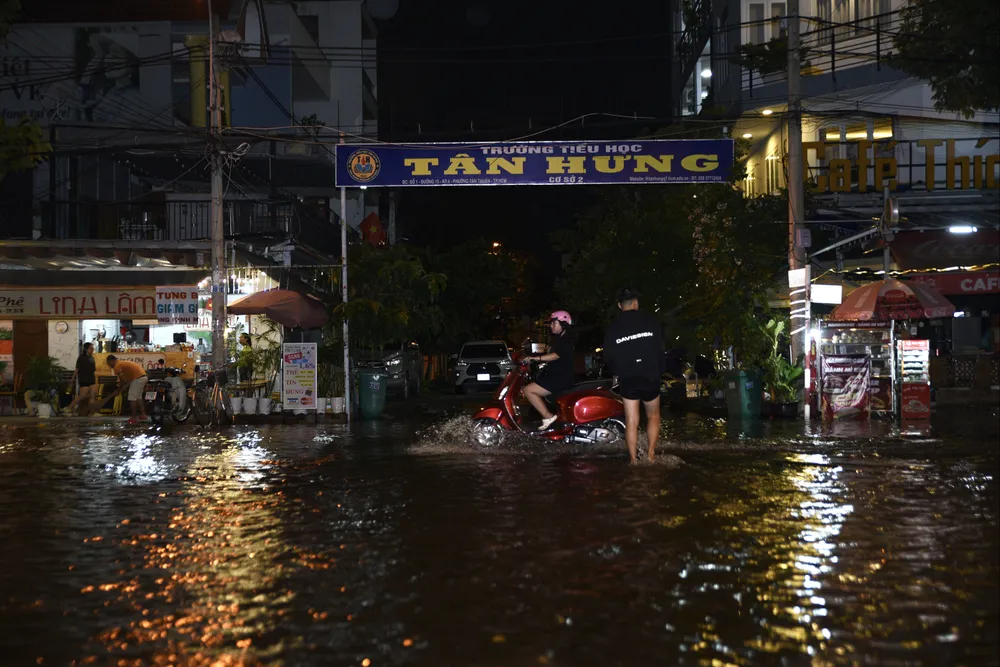 Từ 16 giờ 6-11, triều cường dâng cao, một số tuyến đường tại TP.HCM ngập trong nước. Tại đường Trần Xuân Soạn (phường Tân Thuận, TP.HCM), triều cường dâng cao, nước từ sông tràn vào khiến nhiều tuyến đường ngập sâu.