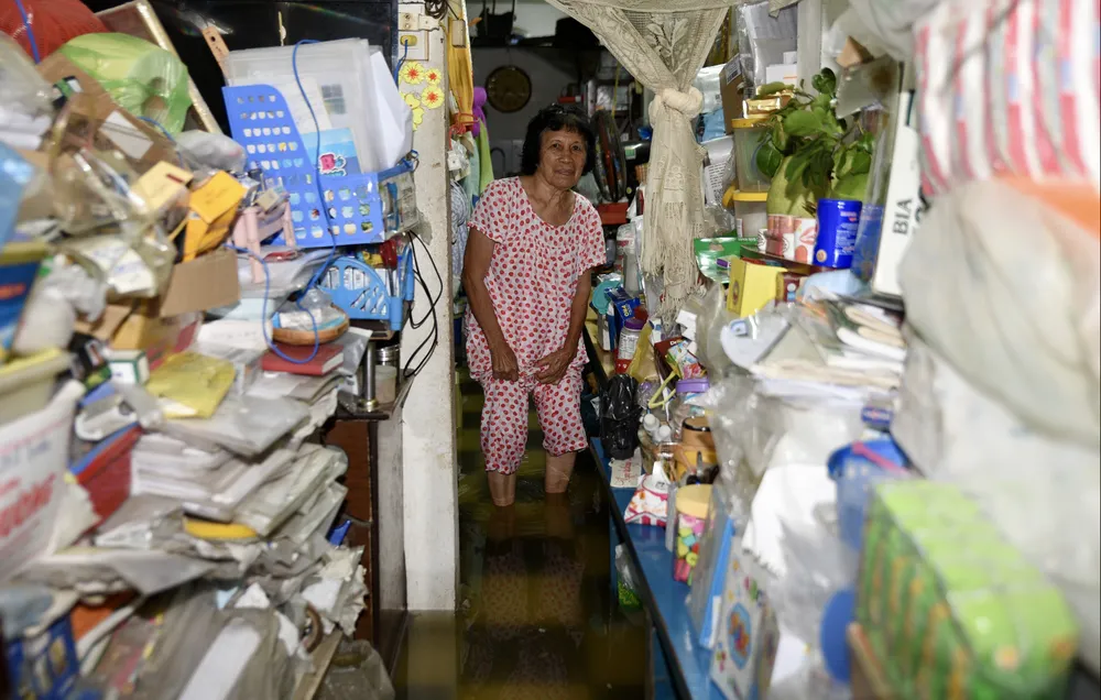 Trên đường 14A (khu Cư xá Ngân hàng, phường Tân Thuận) người dân tranh thủ dọn dẹp đồ đạc đang ngập bì bõm trong nước.