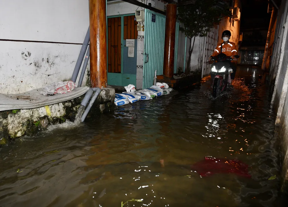 Trong các tuyến hẻm, nước ngập sâu, người dân phải dùng bao cát để đắp tạm ngăn nước không tràn vào nhà.