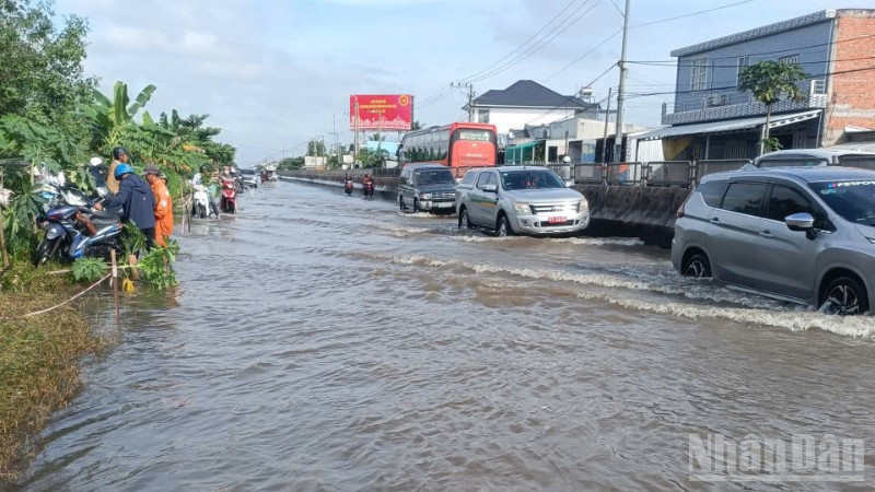 Triều cường gây ngập trên 1 số vị trí thuộc tuyến quốc lộ 1 gây khó khăn cho các phương tiện lưu thông.