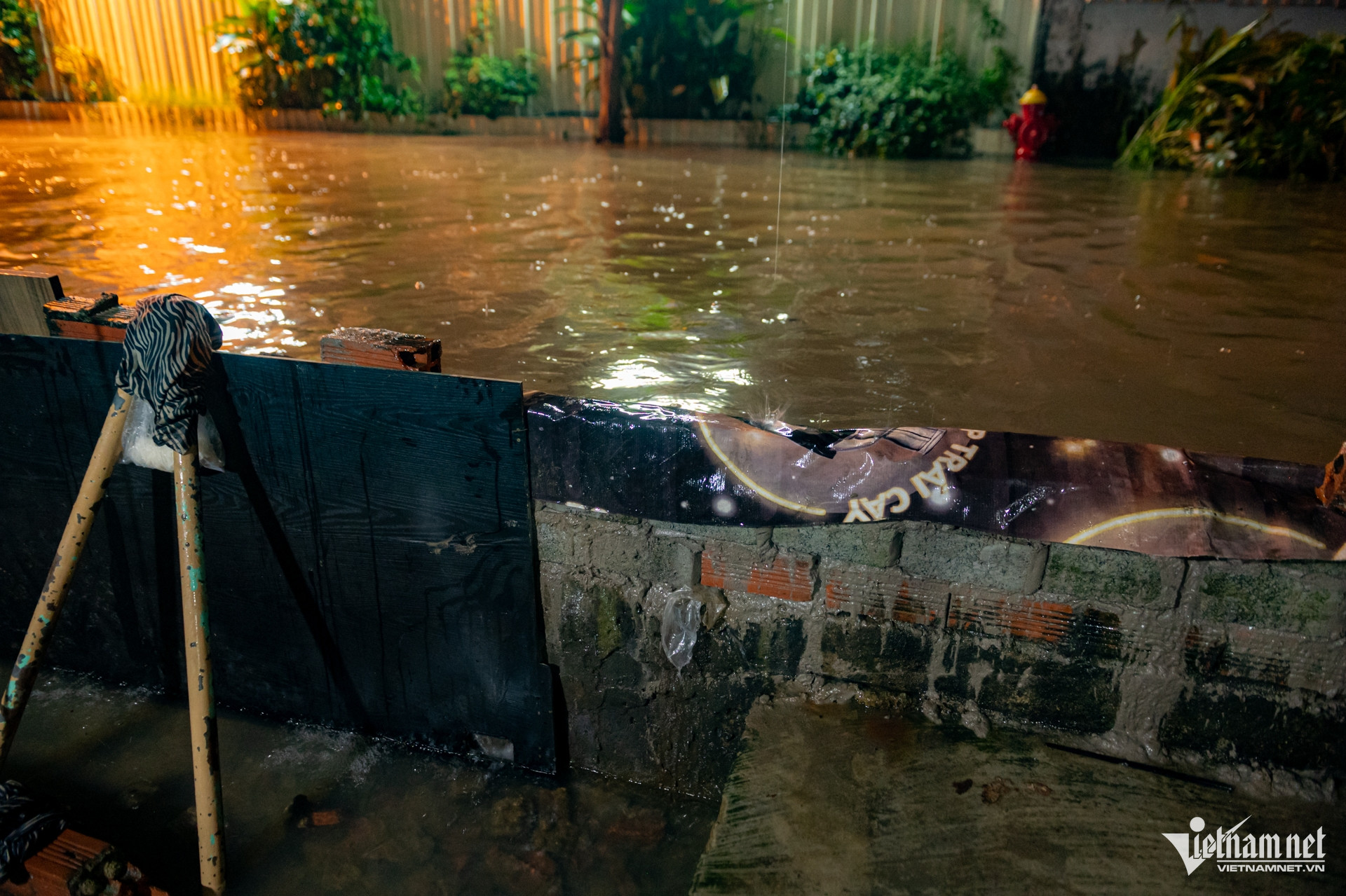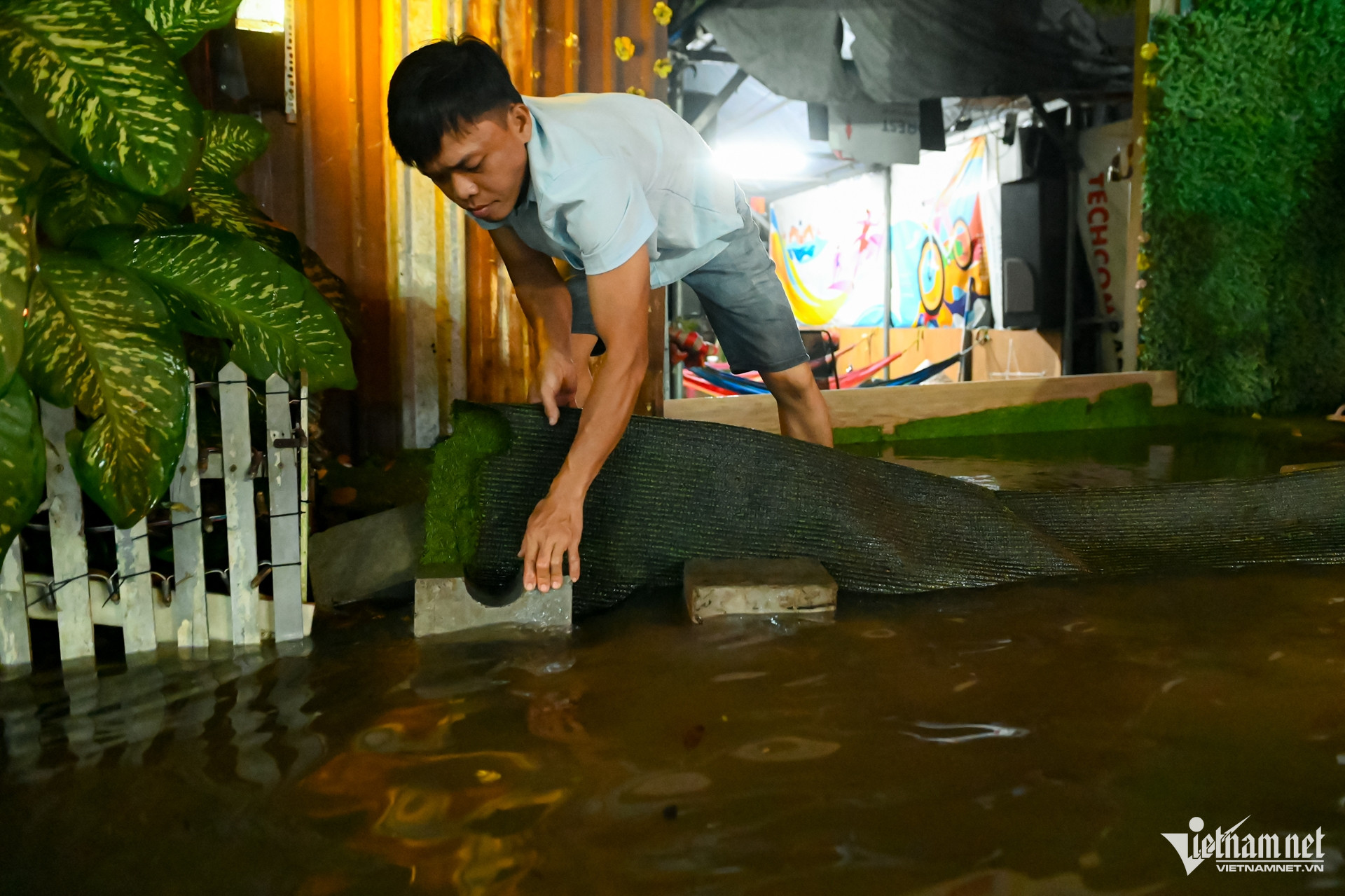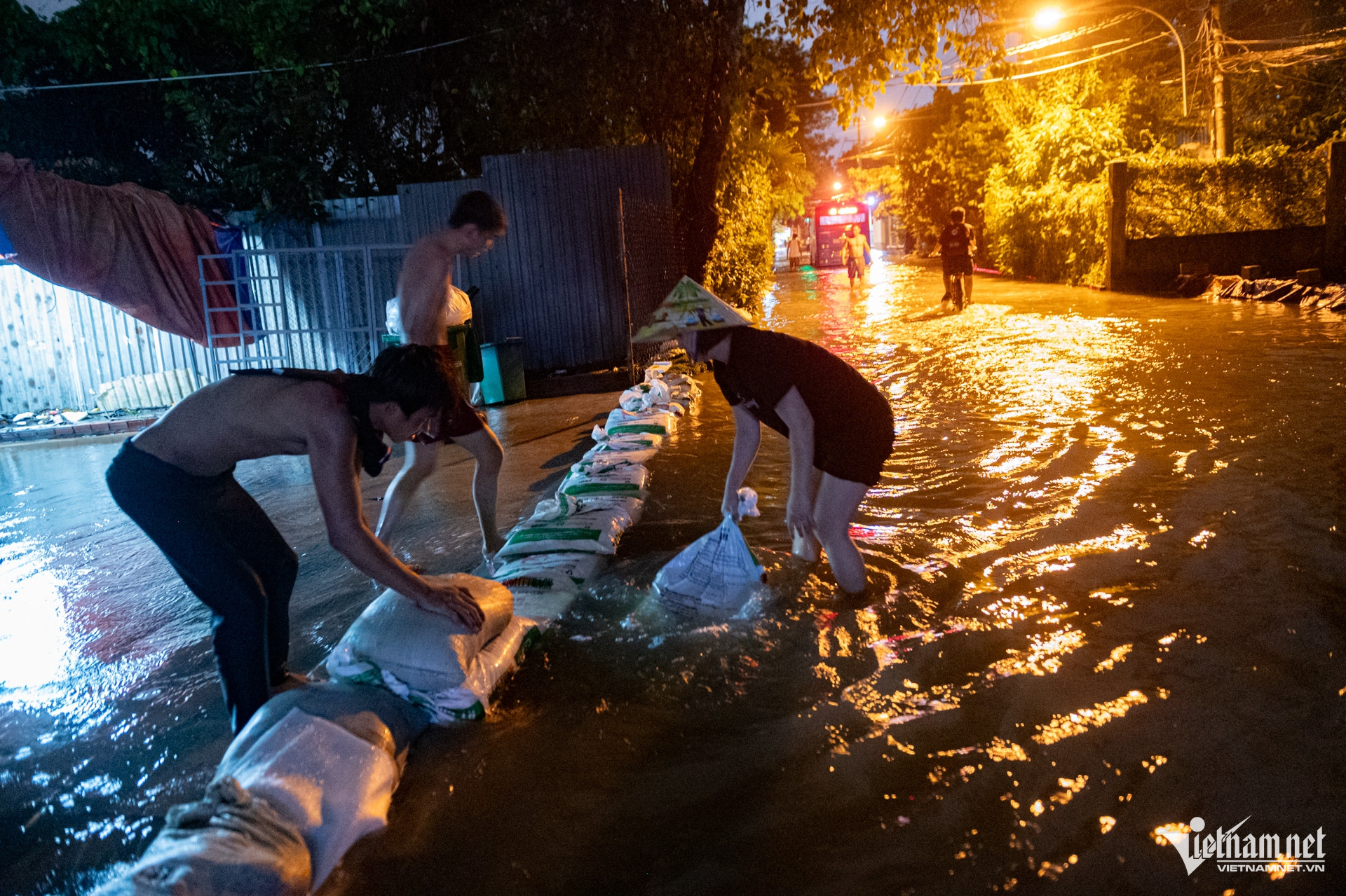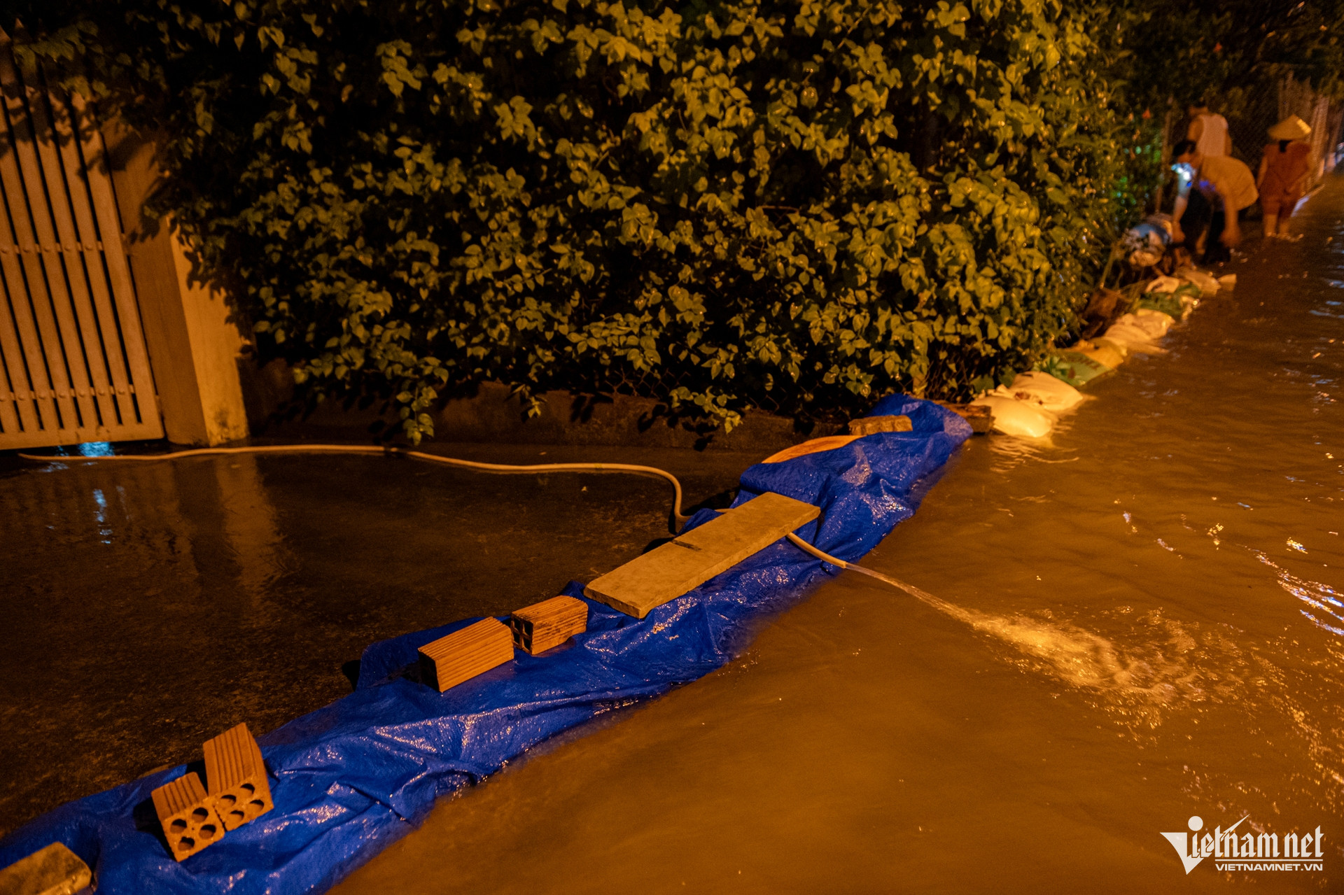 Người dân dù đã chuẩn bị từ những đợt ngập trước vẫn phải túc trực trước cửa nhà, gia cố lại bờ bao và xếp gạch chặn để ngăn nước tràn vào.