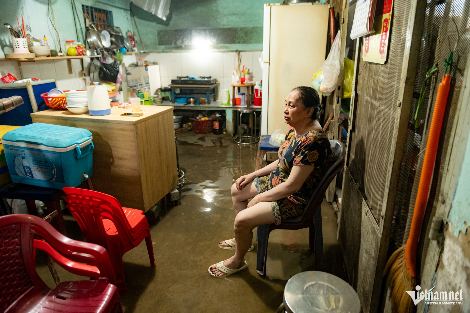 Bà Nguyễn Thị Thu Hồng ngồi trước hiên nhà chờ nước rút. Bà cho biết, chưa kịp lau dọn hết nước hôm qua thì nay nước lại tràn vào. Các con bà phải mua cát về đắp thêm bờ bao để ngăn nước.