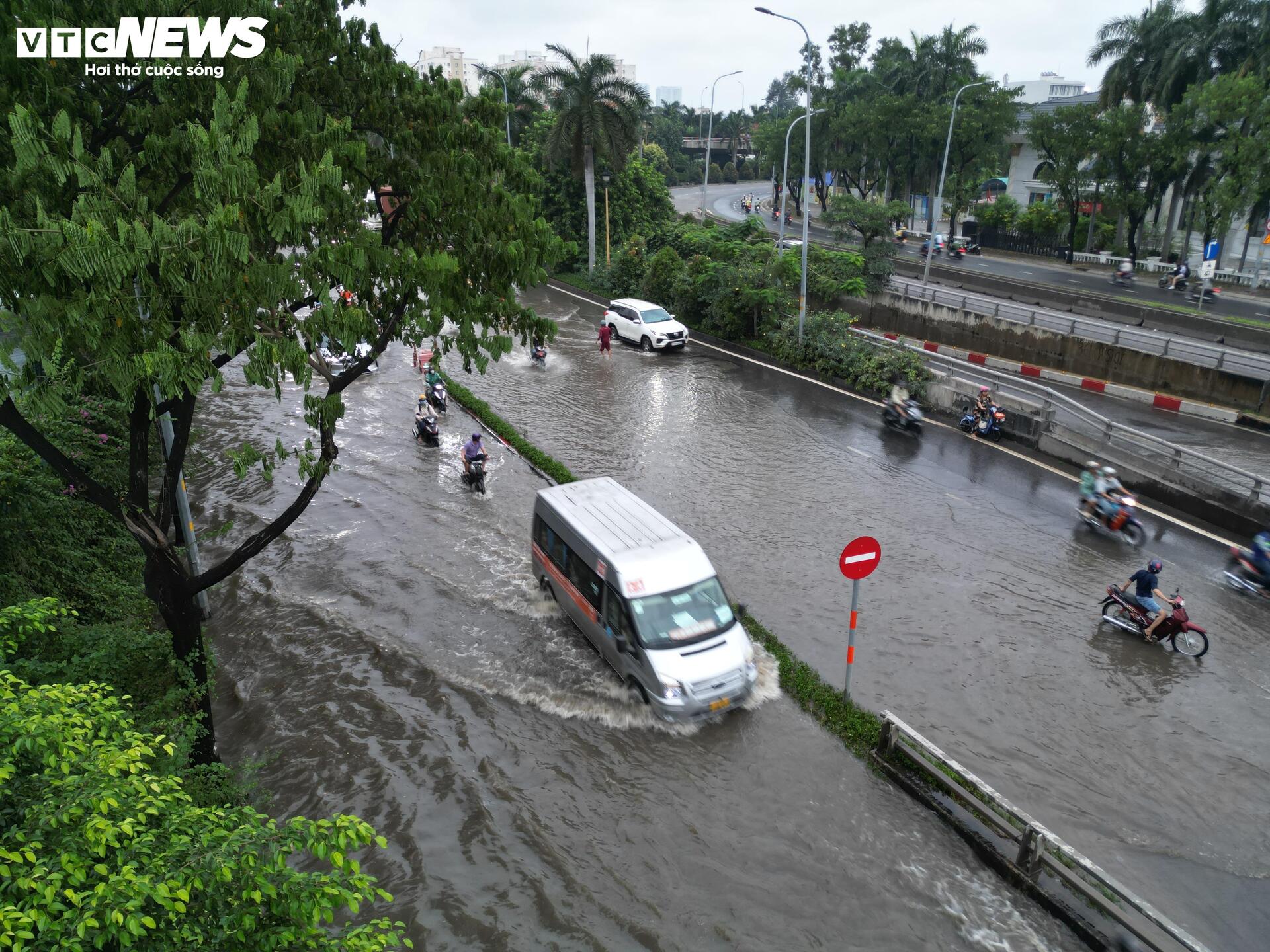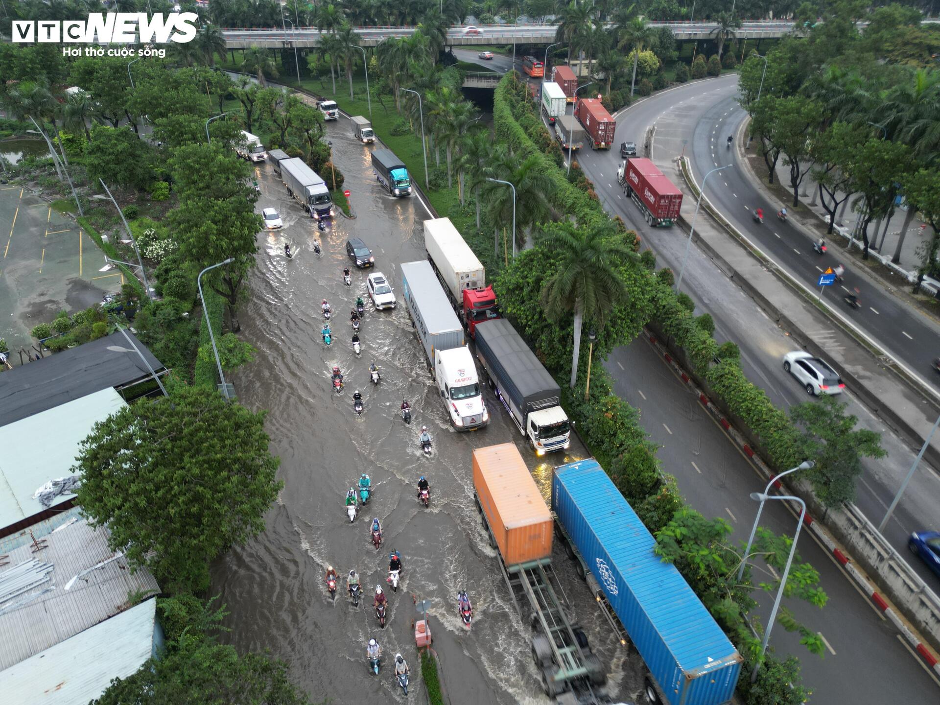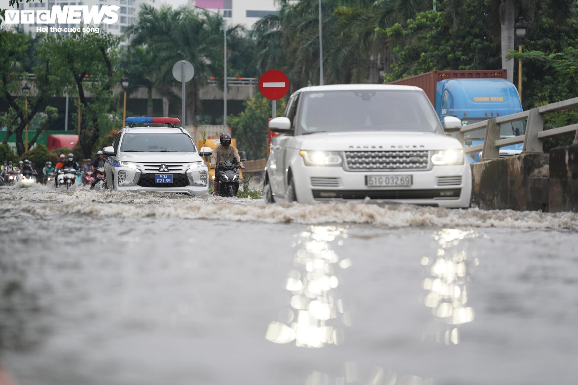 Khoảng 16h20, tại nút giao Nguyễn Văn Linh – Nguyễn Lương Bằng (TP.HCM), triều cường tiếp tục dâng cao, tràn lên mặt đường khiến khu vực này nhanh chóng ngập sâu.
