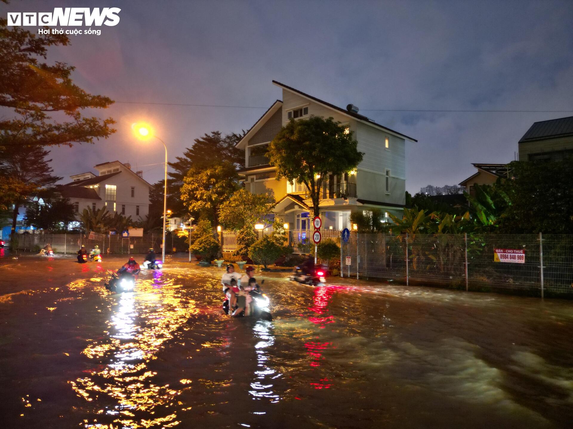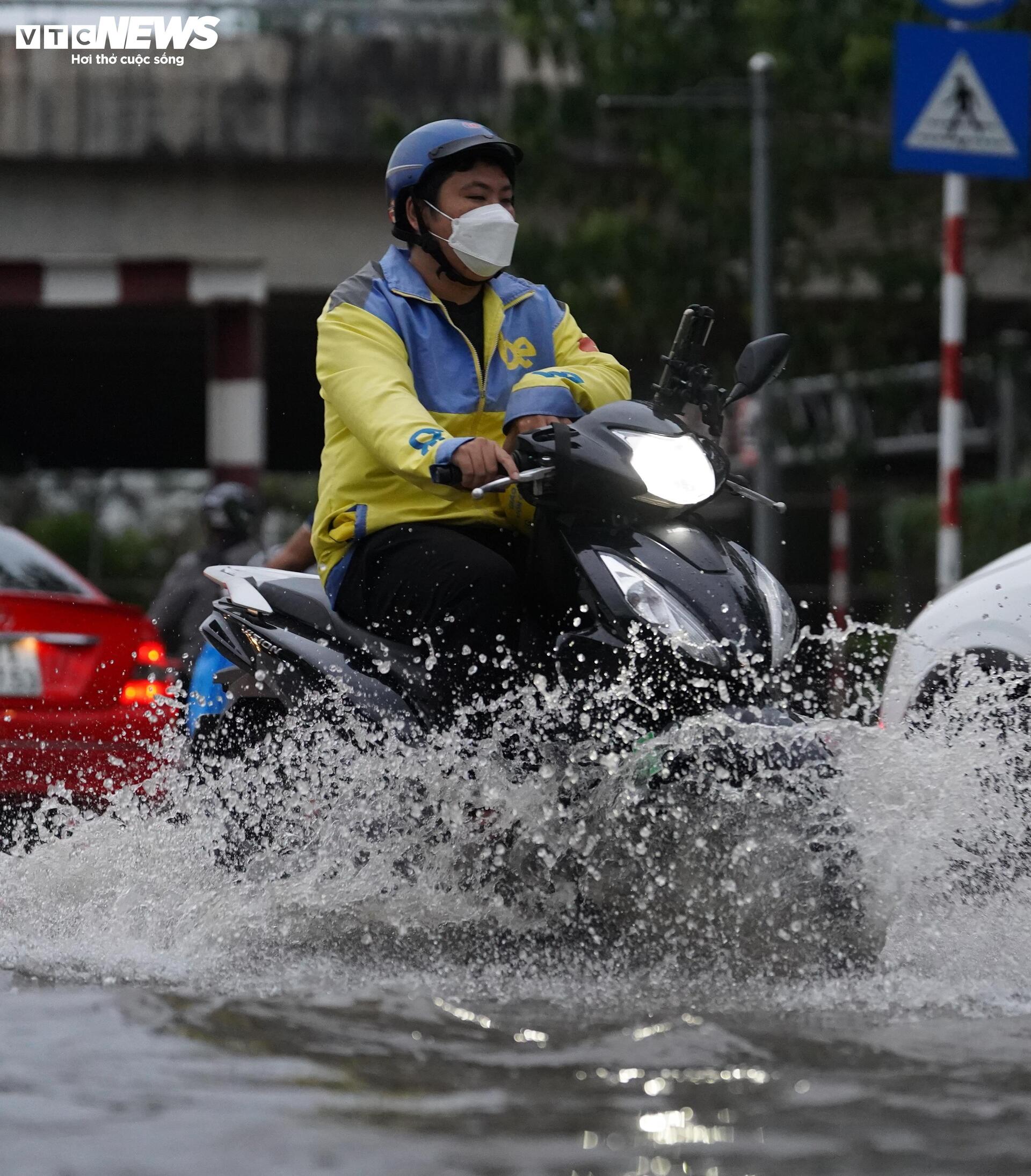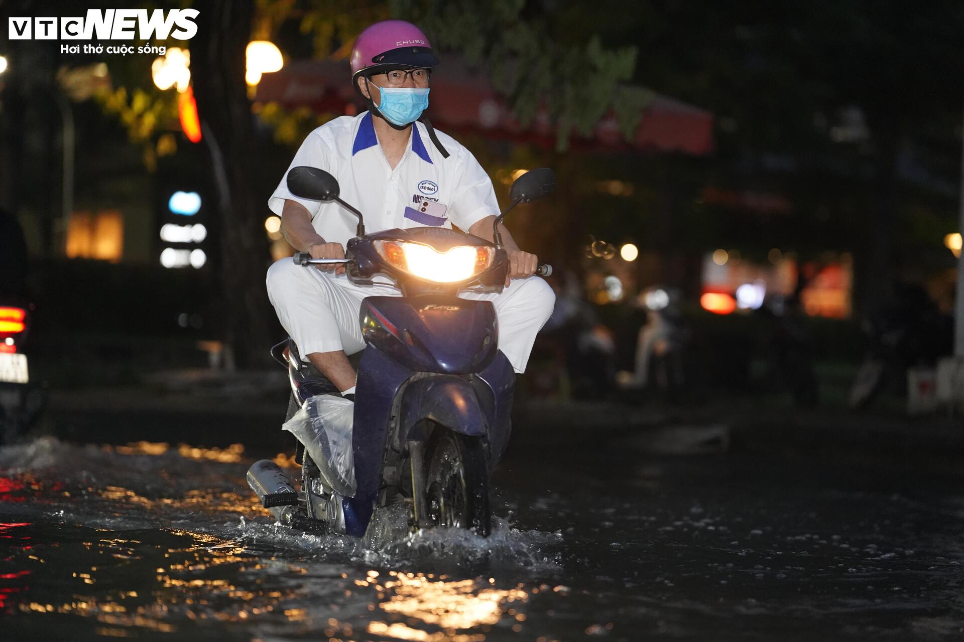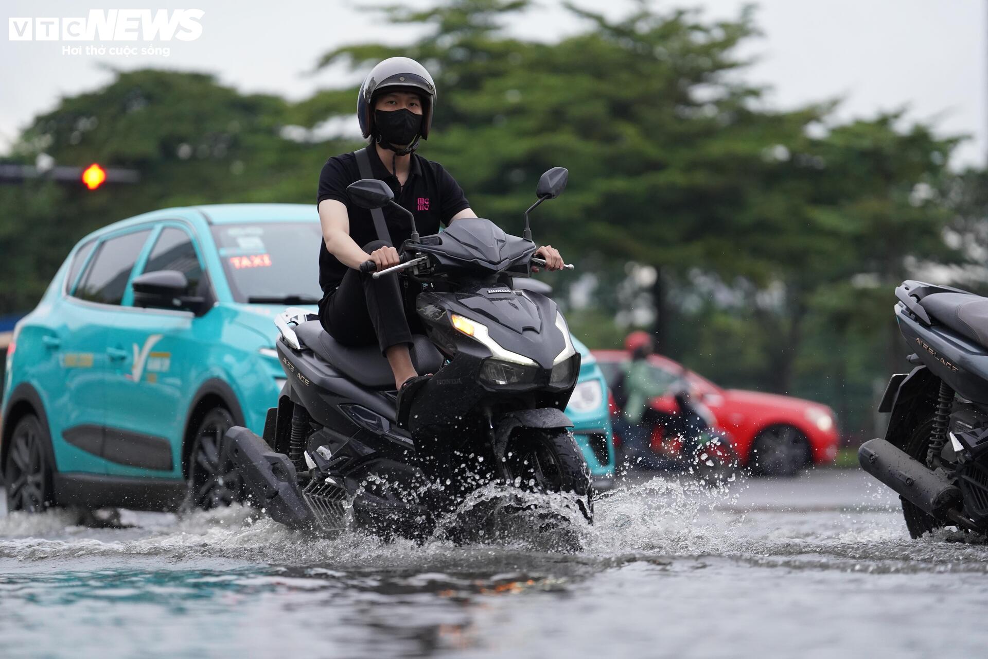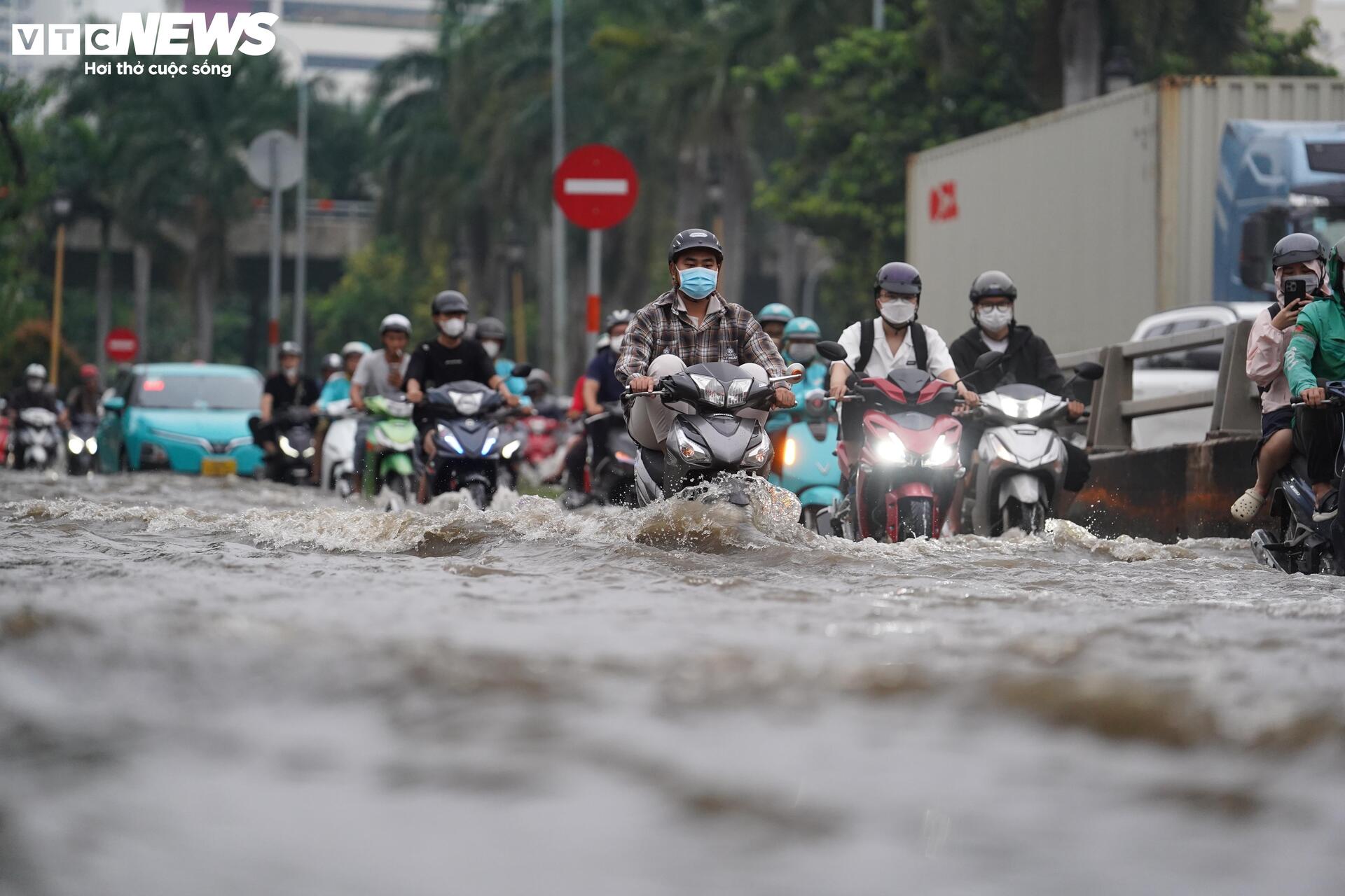 Dòng xe qua lại di chuyển chậm chạp, nhiều xe máy chết máy giữa đường, người dân phải dắt bộ trong làn nước ngập tới nửa bánh xe. Một số tài xế ô tô phải đổi hướng đi để tránh đoạn ngập nặng.