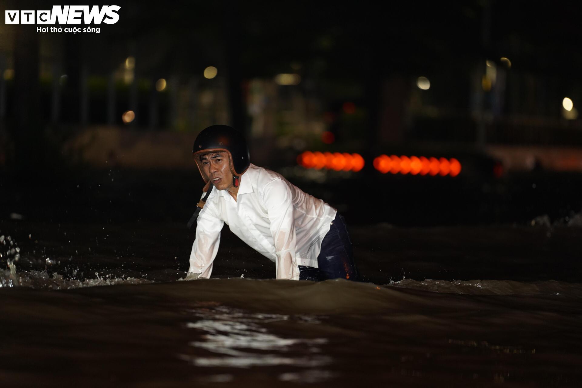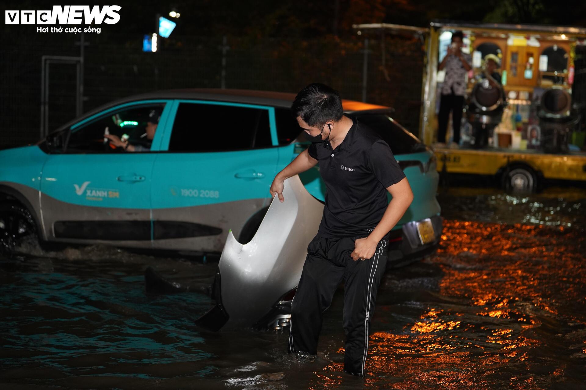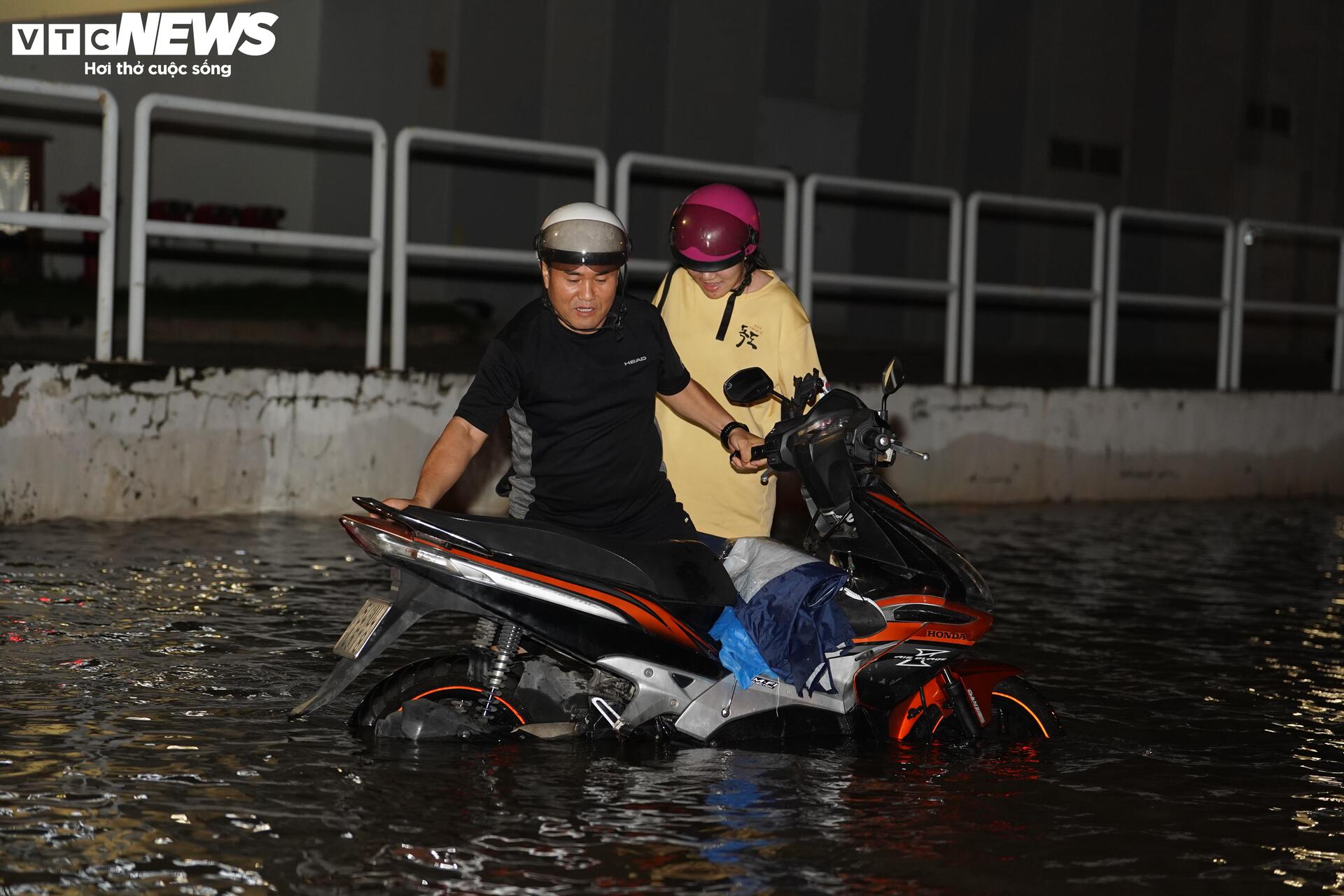 Nhiều tài xế bất chấp nước dâng cao, vẫn cố vượt qua đoạn ngập sâu quanh khu trung tâm thương mại SC VivoCity (TP.HCM). Hàng loạt xe chết máy giữa dòng nước, một số ô tô bị bung vỏ, trôi theo dòng chảy xiết, còn người đi xe máy loạng choạng, ngã sóng soài giữa đường