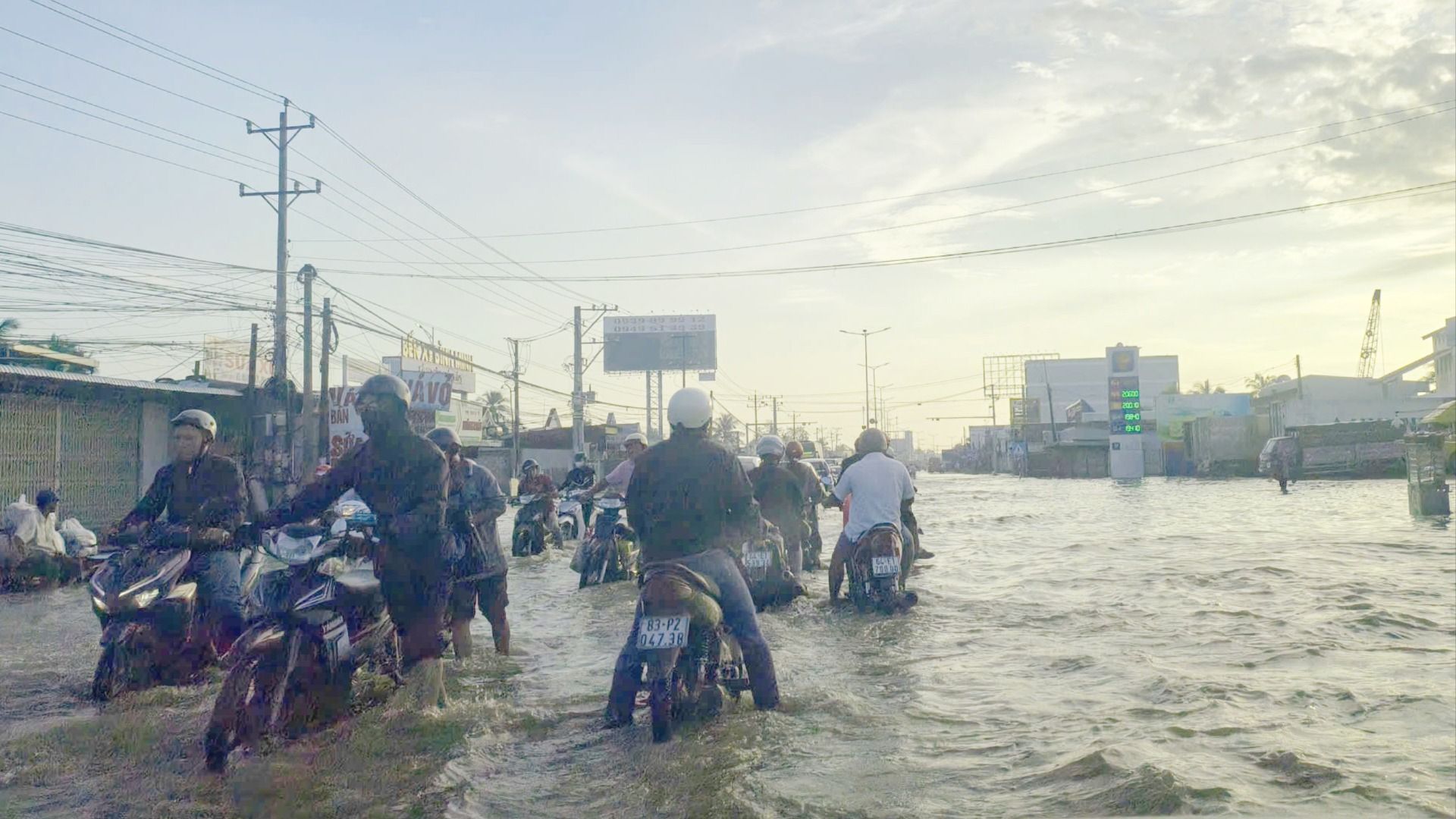 Triều cường dâng cao buổi sáng, khiến các phương tiện lưu thông qua Quốc 1A gặp nhiều khó khăn