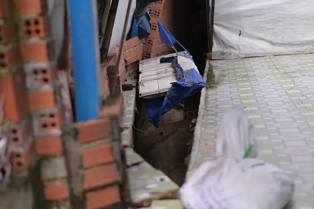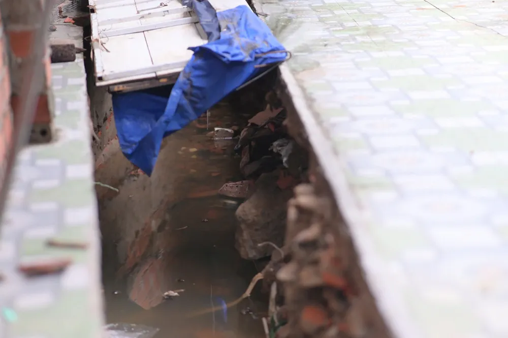 “Thấy nước tràn vào, tôi vội lấy bao cát chắn lại để khỏi đổ sang nhà kế bên nhưng dòng chảy mạnh quá, tường không chịu nổi, bị kéo dịch ra xa, lộ ra hố sâu hoắm” - ông Hùng kể lại.