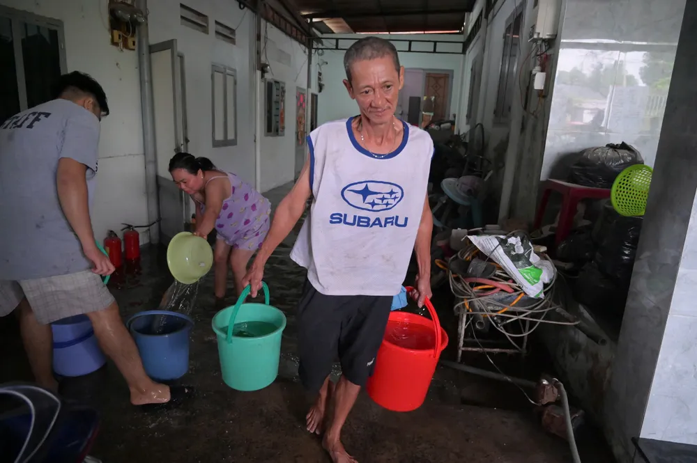 Người dân phường Bình Quới tất bật dùng xô, chậu múc nước ra khỏi nhà sau khi triều cường tối 24-10 rút chậm, nền nhà vẫn ngập sâu gần nửa mét. Ảnh: PHẠM HẢI