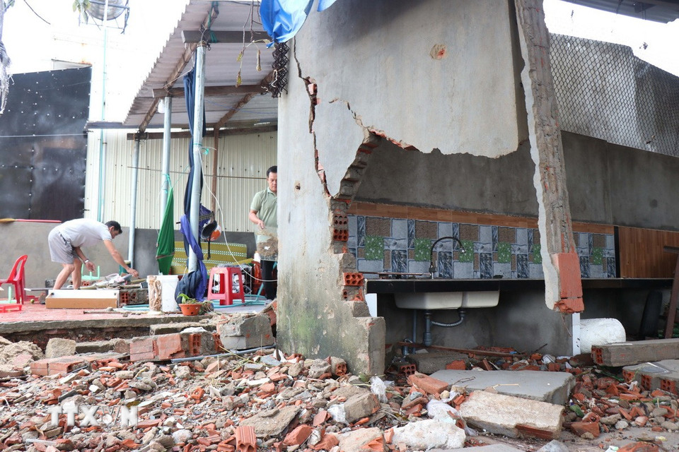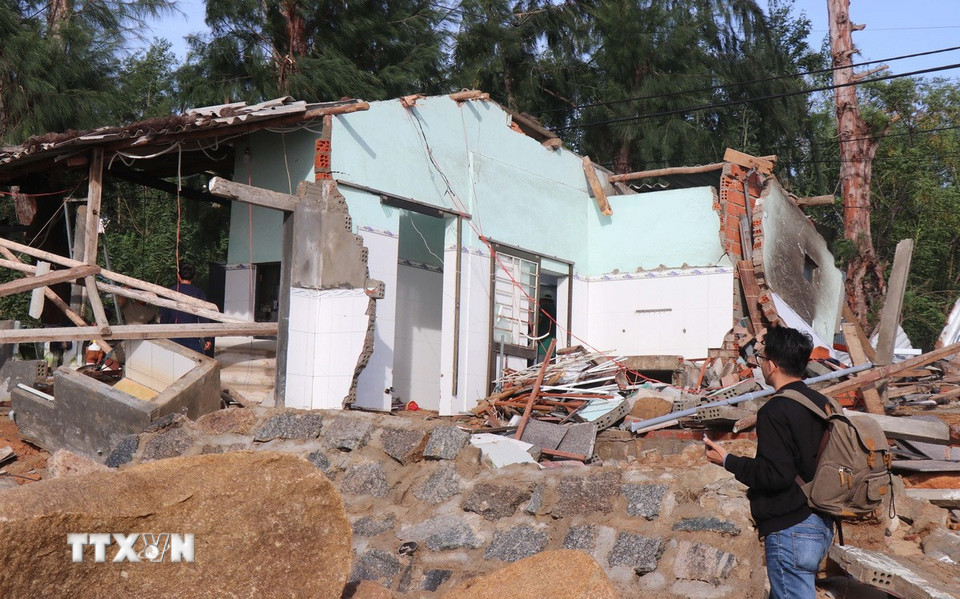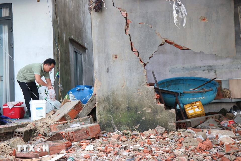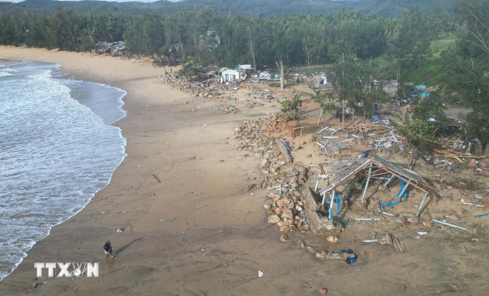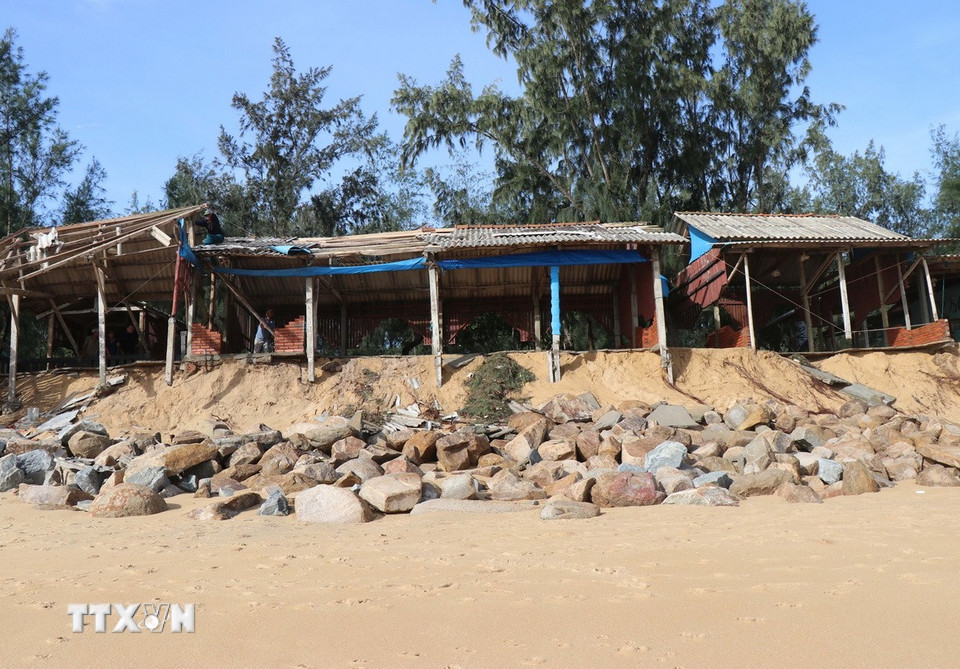 Triều cường đêm 6/11 gây sạt lở bờ biển, làm sập hàng chục hàng quán Tổ dân phố Châu Me, phường Sa Huỳnh, tỉnh Quảng Ngãi. (Ảnh: Phạm Cường/TTXVN)