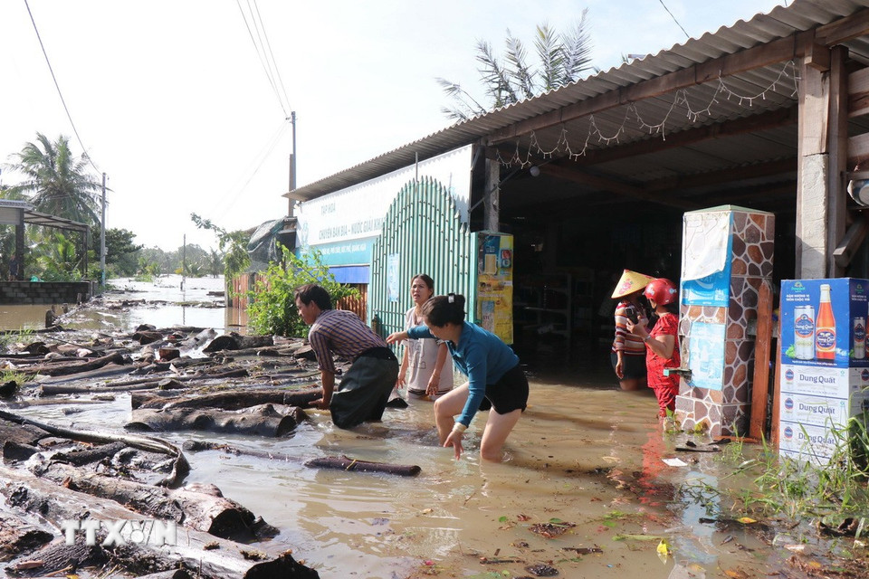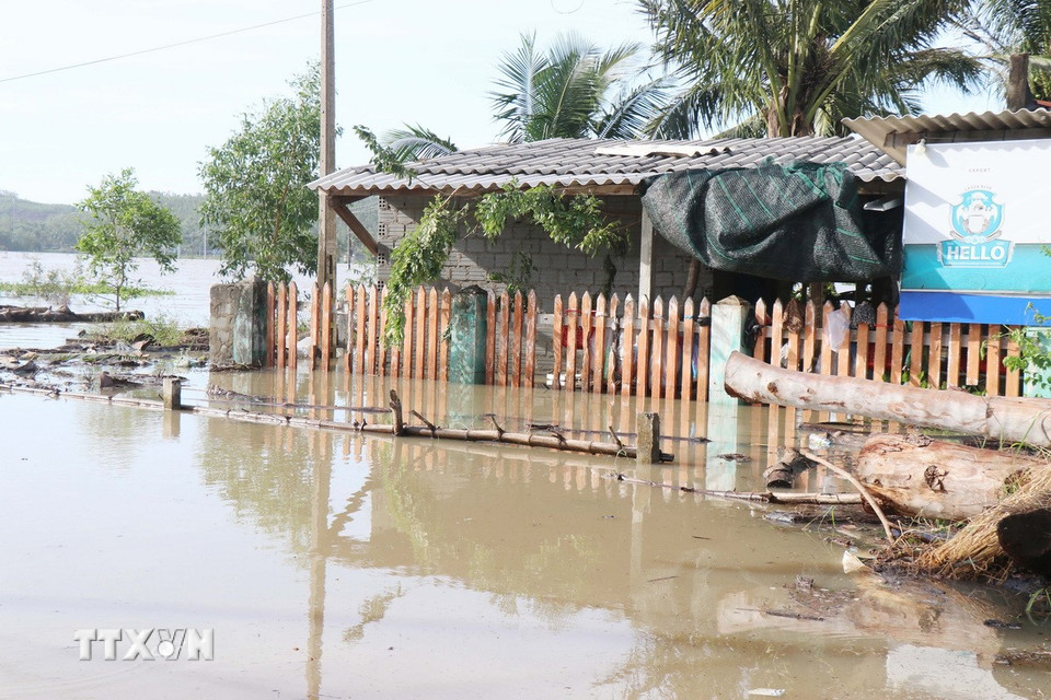Nhà ở người dân Tổ dân phố Châu Me, phường Sa Huỳnh, tỉnh Quảng Ngãi vẫn ngập sâu do triều cường đêm 6/11. (Ảnh: Phạm Cường/TTXVN)