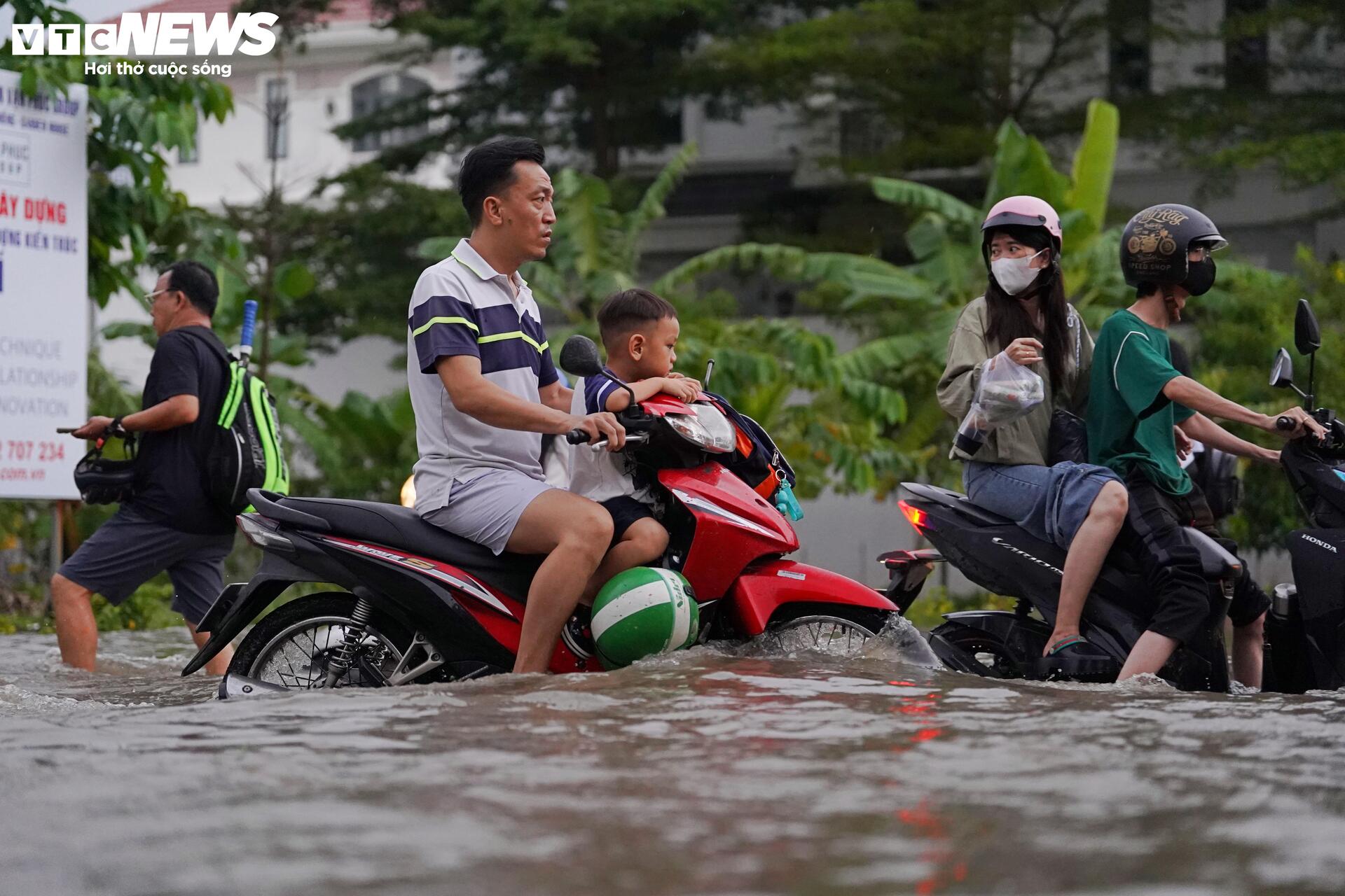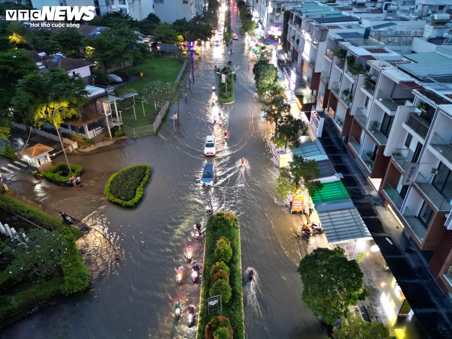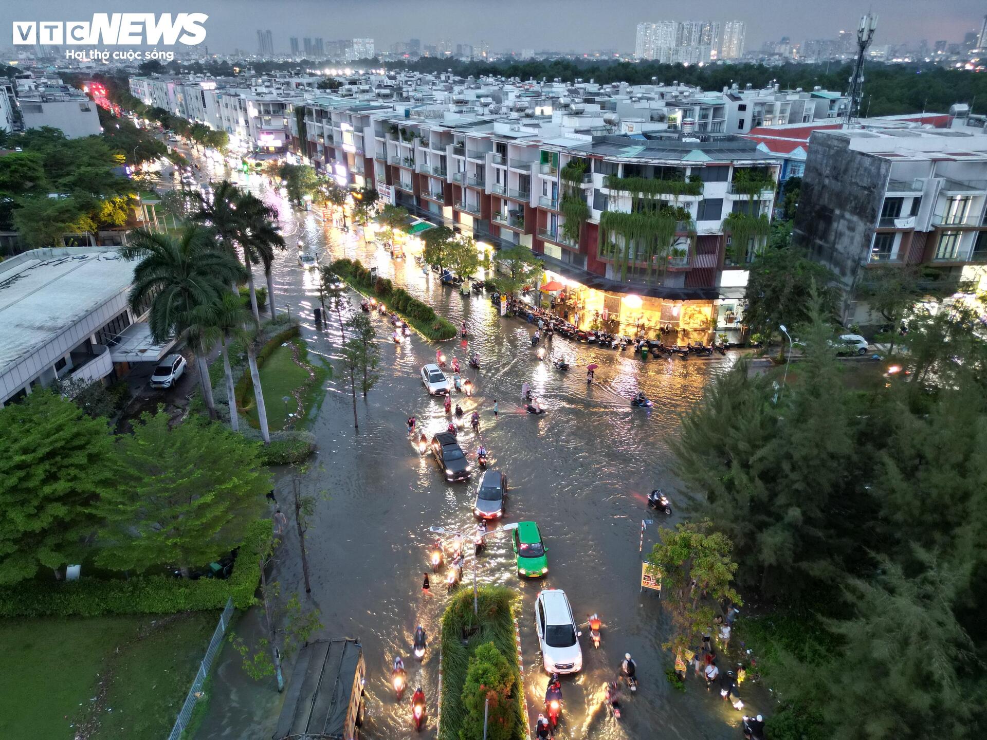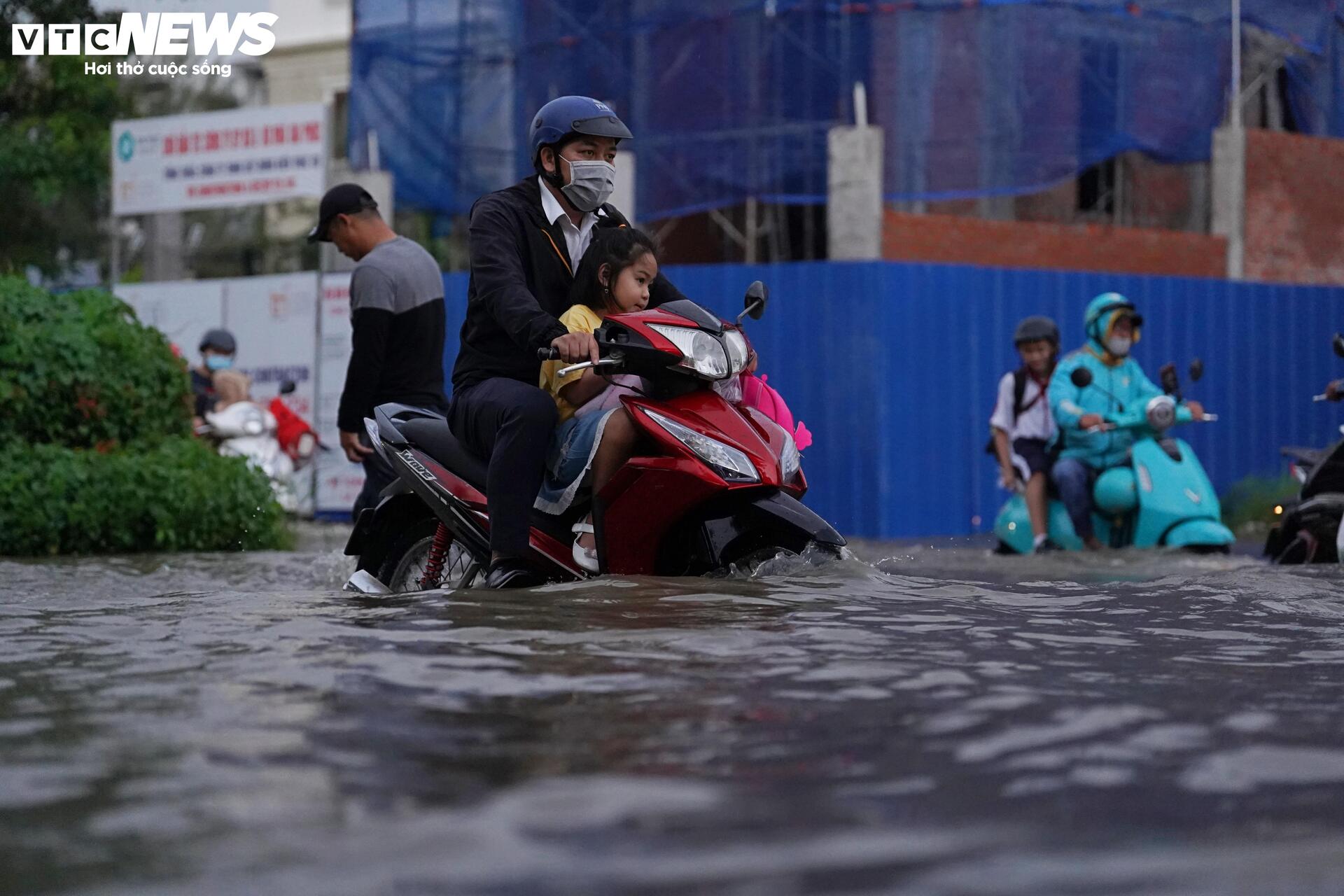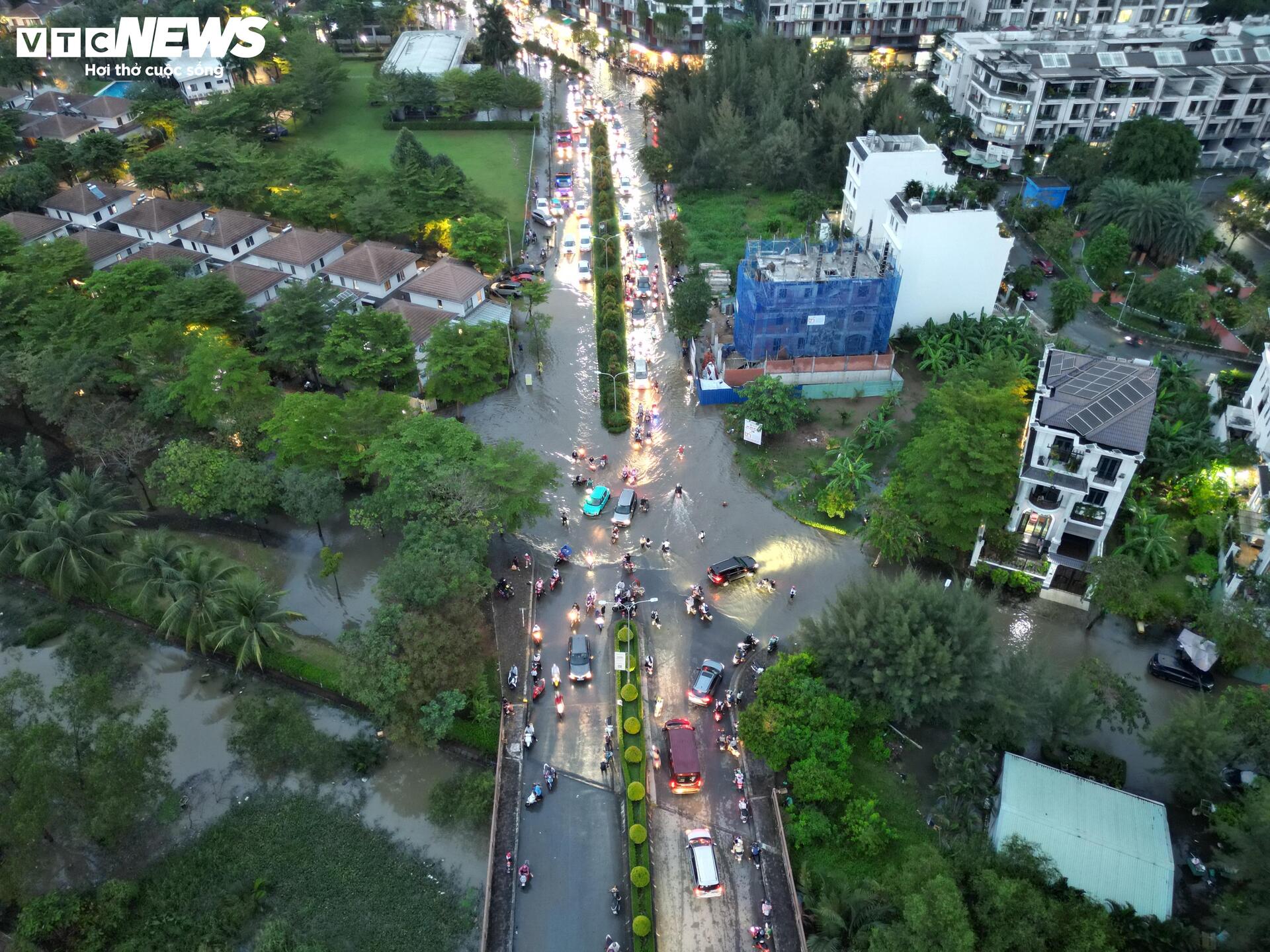 Chiều 5/11, ghi nhận của phóng viên Báo Điện tử VTC News, triều cường kết hợp mưa lớn khiến tuyến đường số 1, khu đô thị Mizuki Flora (xã Bình Hưng, TP.HCM) ngập sâu, nhiều đoạn biến thành “sông”. Nước dâng cao khiến việc đi lại, sinh hoạt của người dân bị đảo lộn.