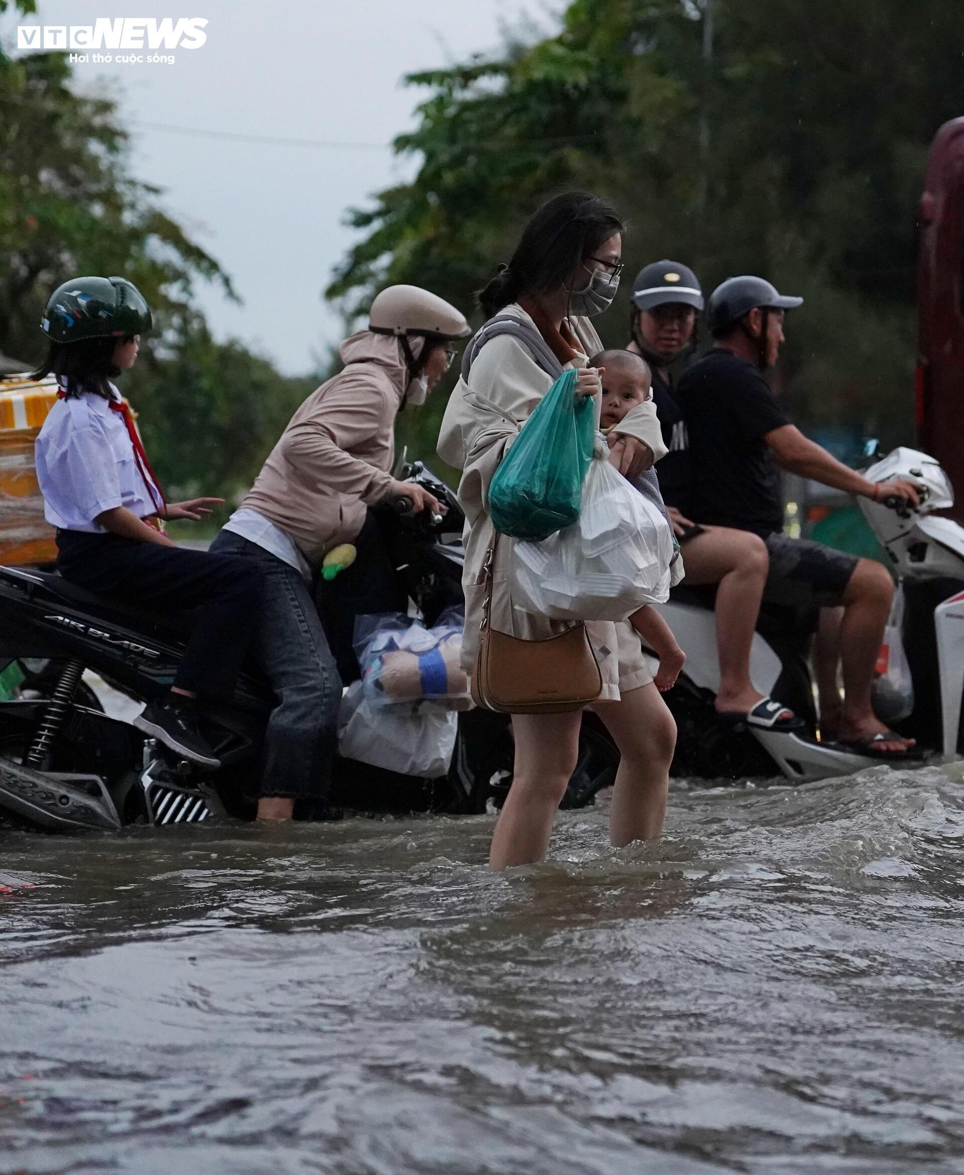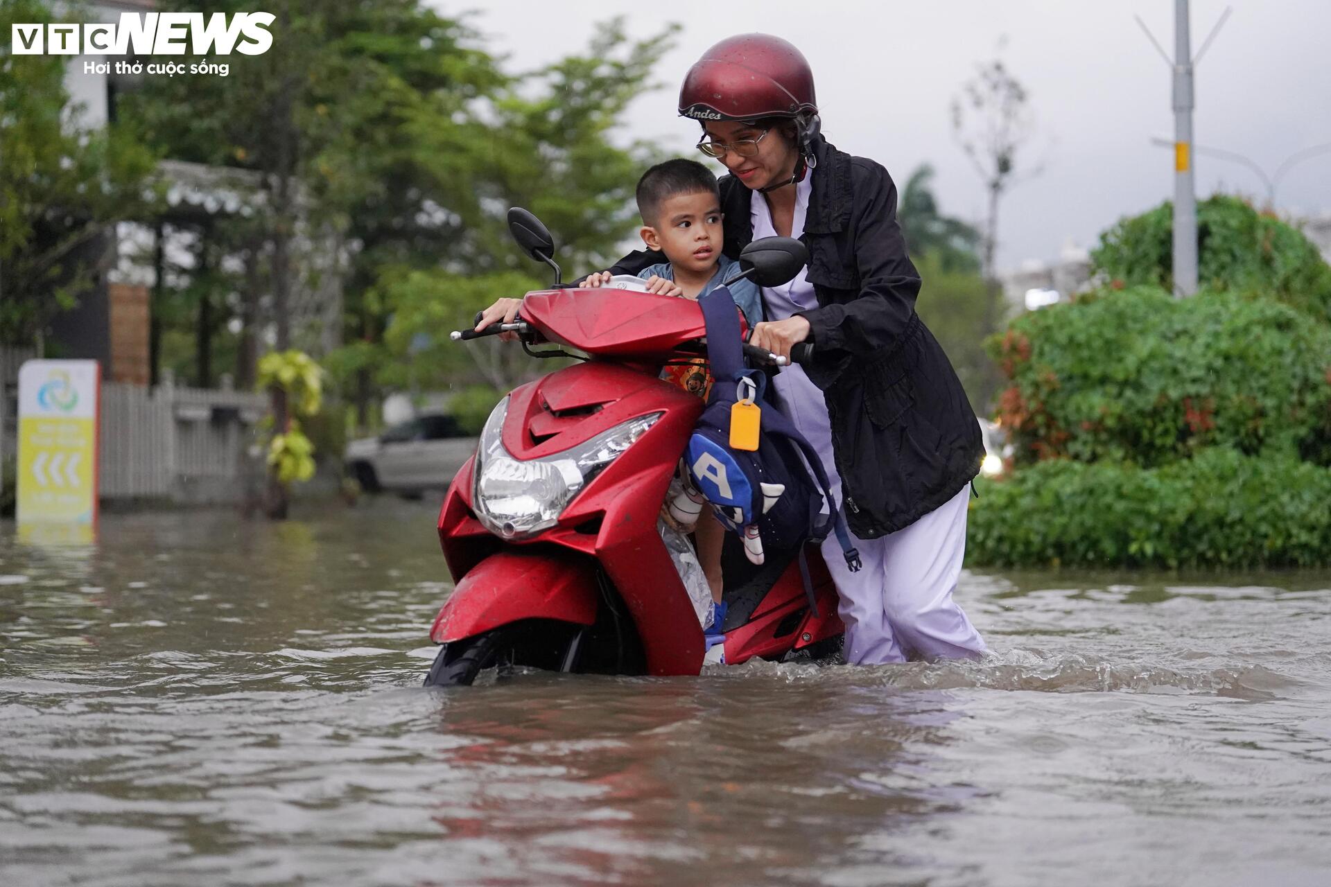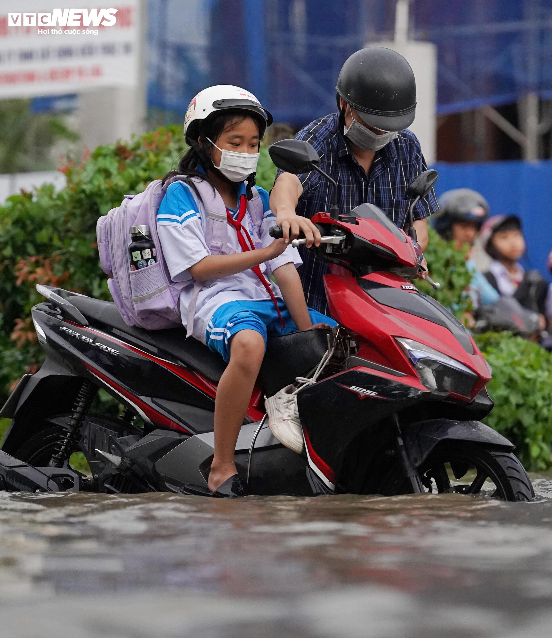 Nước dâng cao, nhiều phụ huynh phải dắt bộ do xe chết máy.