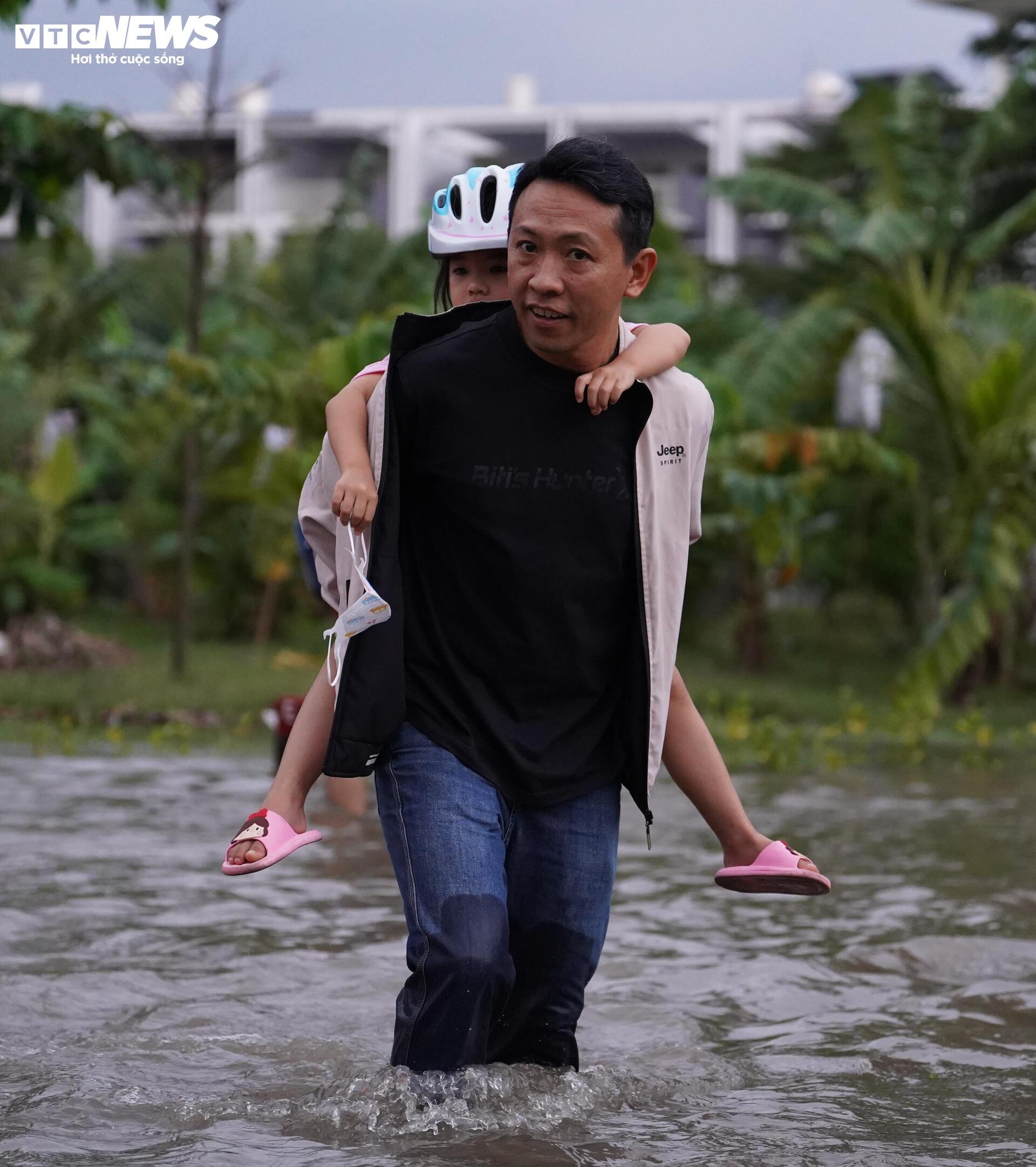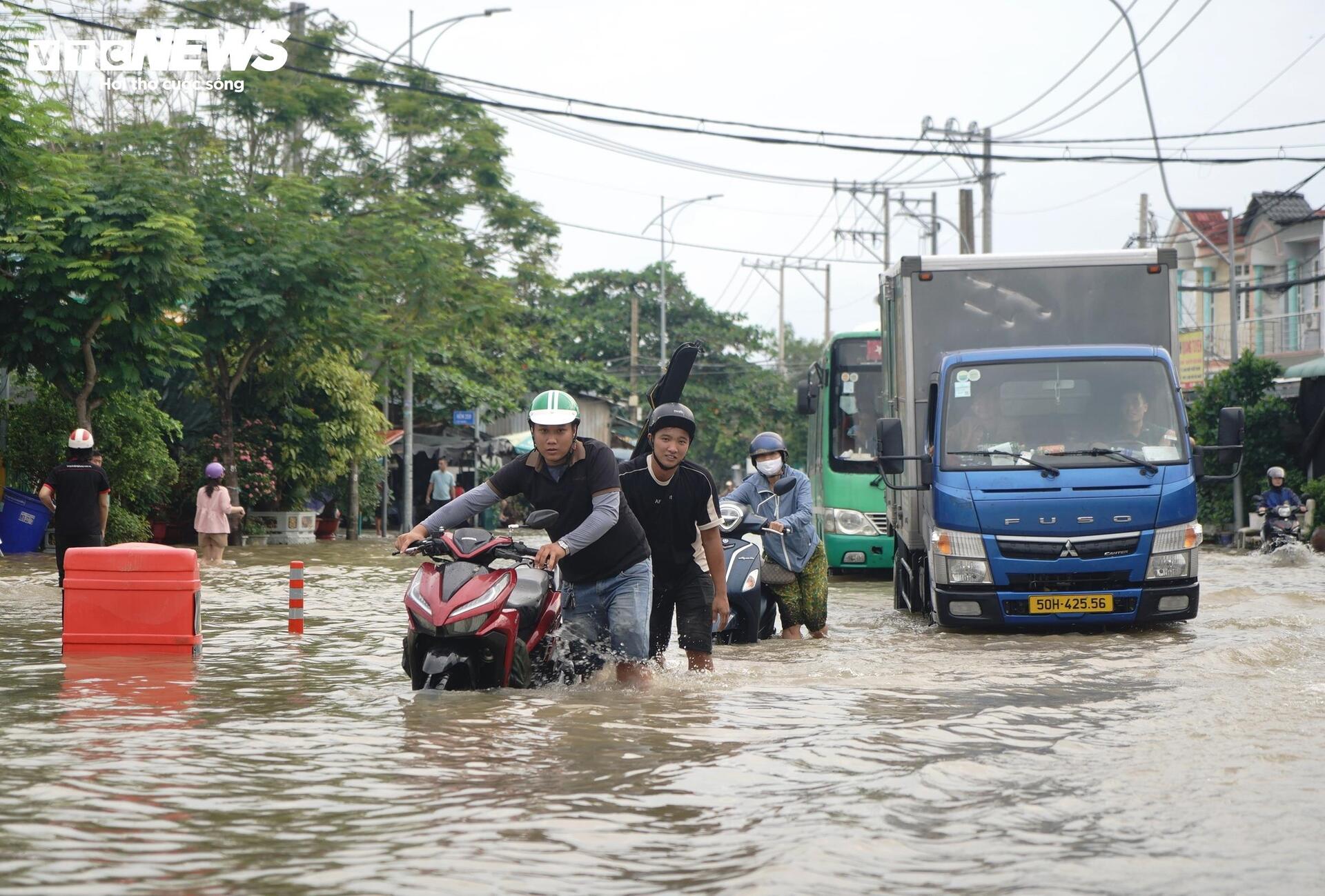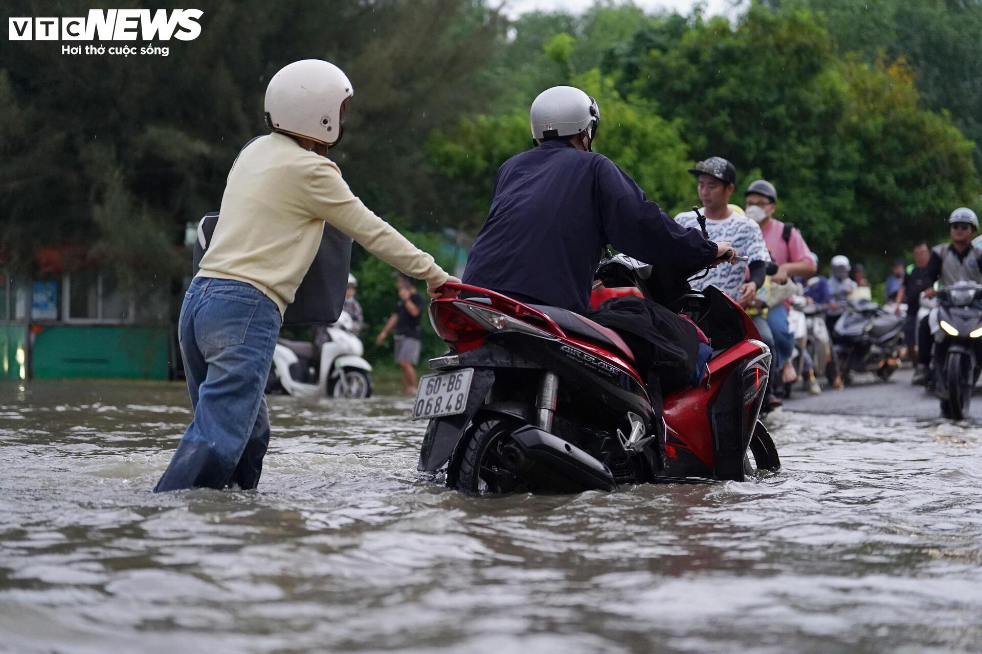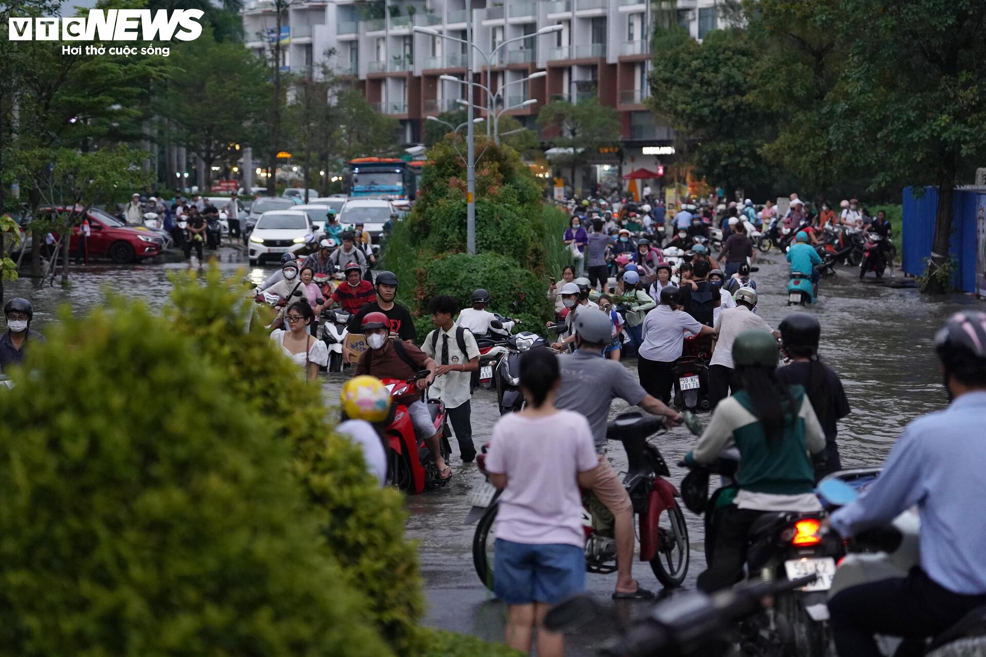 Đến 18h40 cùng ngày, tuyến đường dẫn vào khu đô thị Mizuki Flora (xã Bình Hưng, TP.HCM) vẫn chìm trong biển nước, nhiều đoạn ngập sâu quá nửa bánh xe. Ghi nhận tại hiện trường, nước vẫn chưa có dấu hiệu rút, người dân phải dắt bộ, lội nước giữa dòng xe chết máy nối dài trên đường.