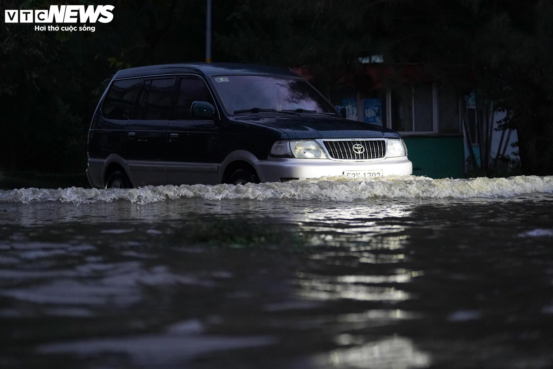 Nước ngập sâu khiến việc đi lại của người dân và các phương tiện vô cùng khó khăn. Mỗi khi ô tô chạy qua, sóng nước dội mạnh tràn vào nhà dân hai bên đường.