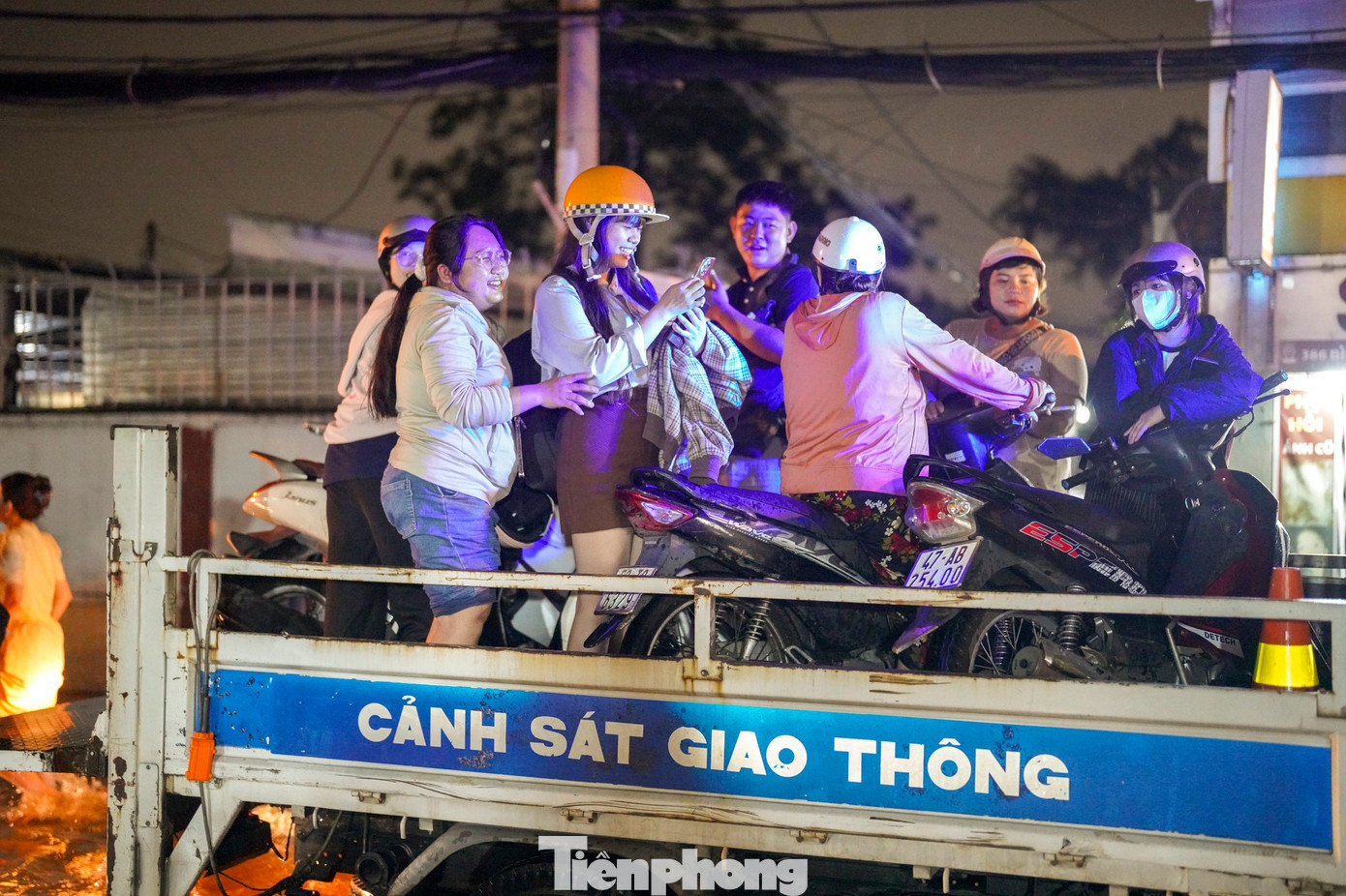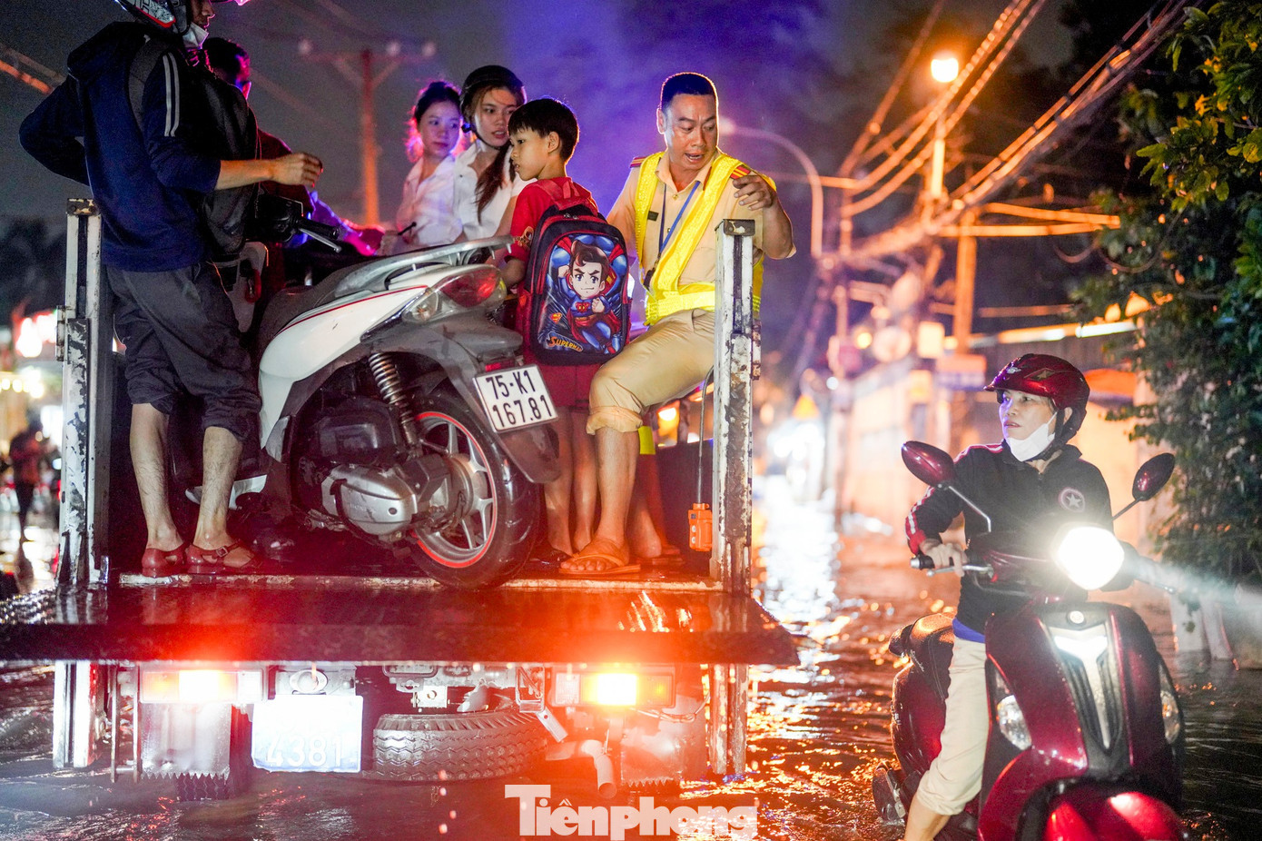 Nhiều xe chuyên dụng của lực lượng công an được đưa vào hỗ trợ, chở hàng trăm người dân cùng xe máy qua khu vực nguy hiểm, cứu hộ phương tiện chết máy, hướng dẫn di chuyển an toàn.