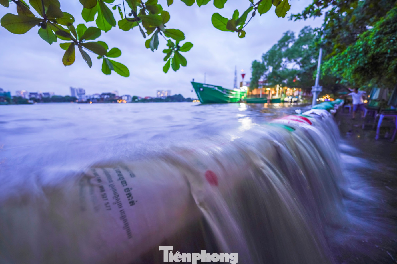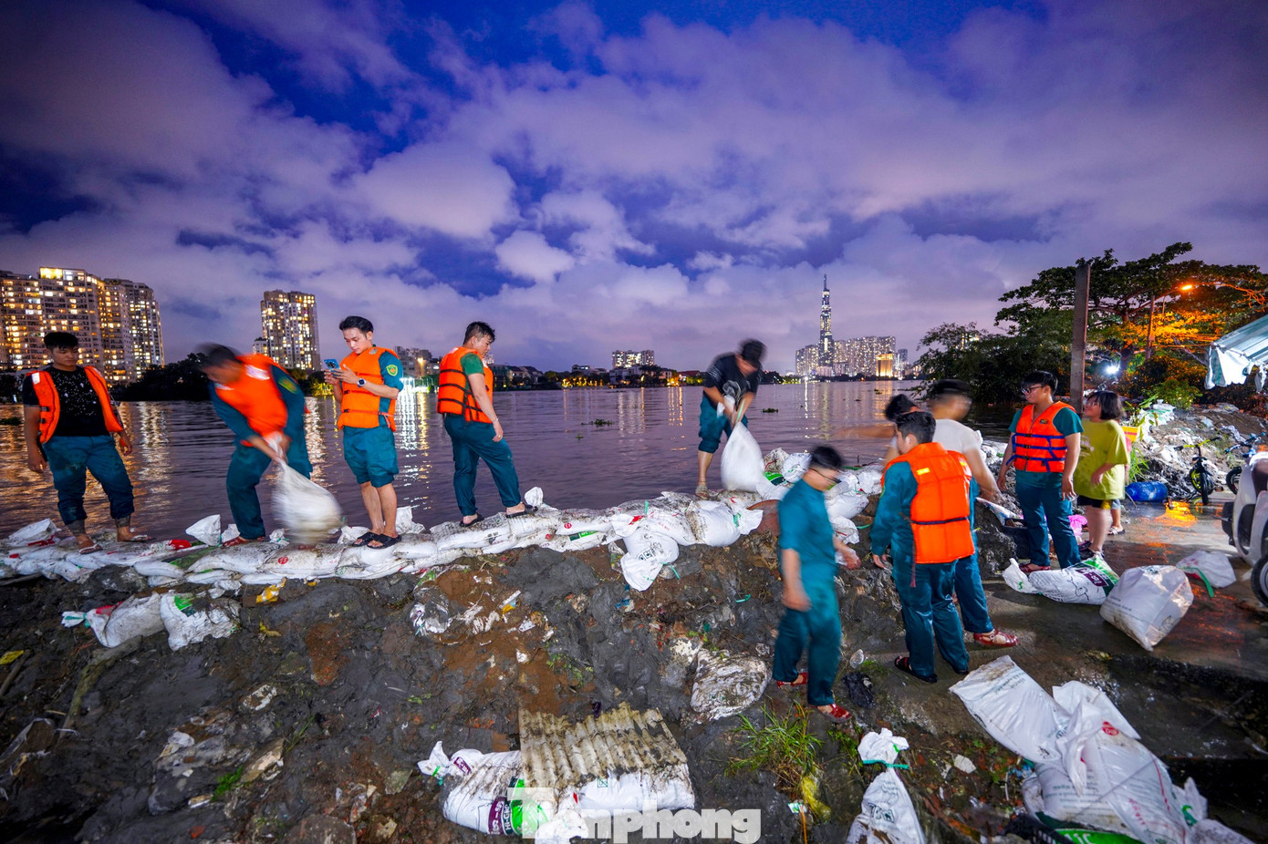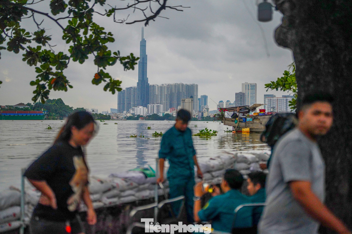 Một đoạn kè được lực lượng Dân phòng gia cố bao cát chắn sóng trên sông Sài Gòn, đoạn gần cầu Sài Gòn.