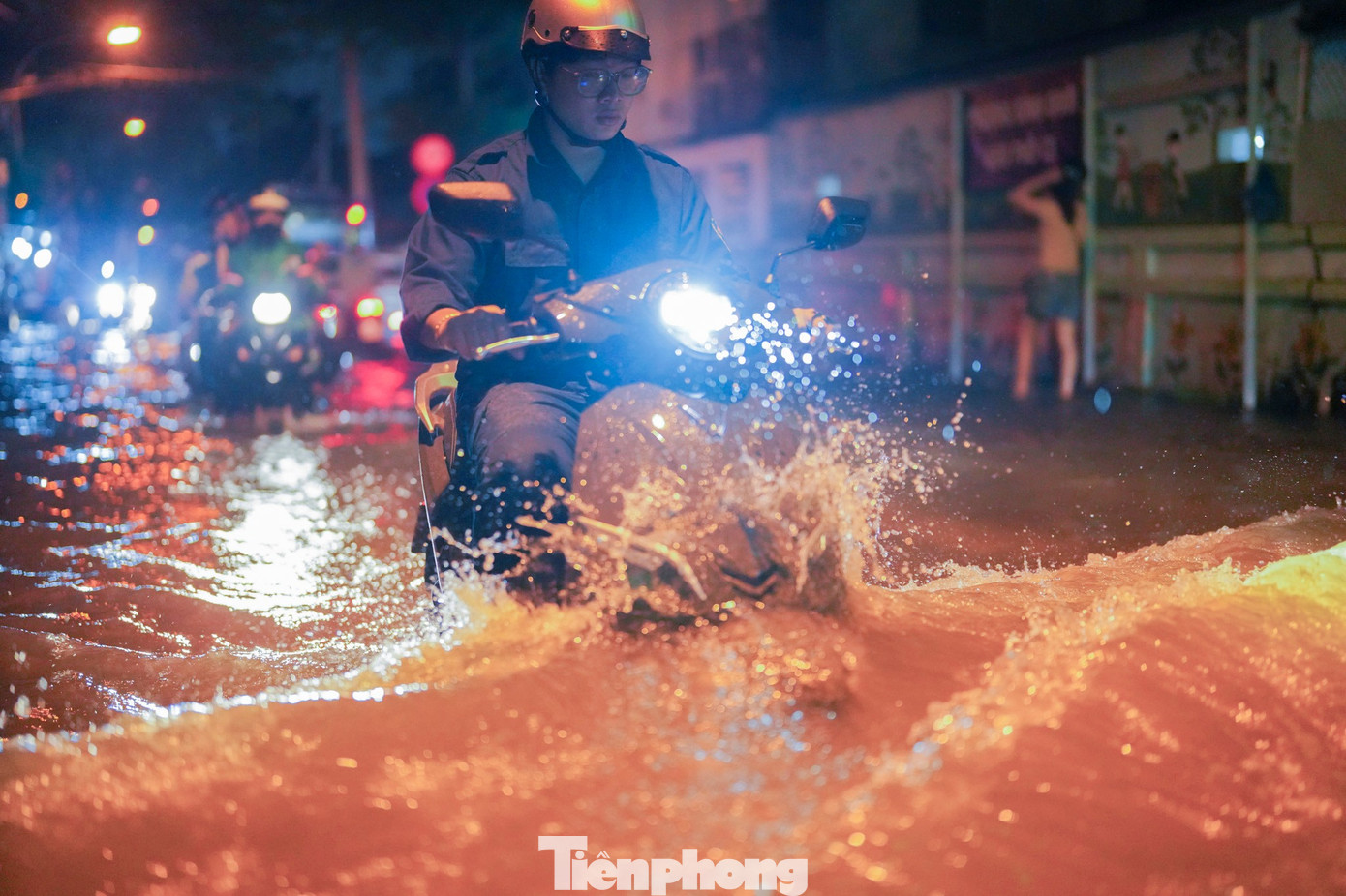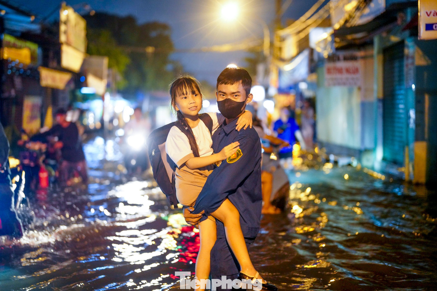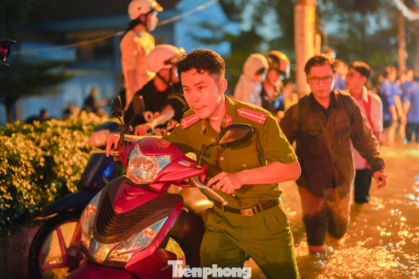 Các chiến sĩ công an, dân quân trẻ bế học sinh trên tay, dẫn hộ xe máy cho người dân, lội bì bõm giữa dòng xe đang ngập nước.