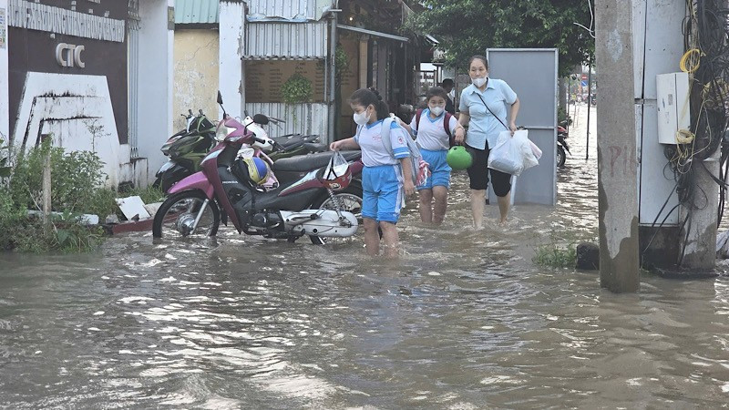 Nước ngập các tuyến đường ở Cần Thơ sáng 9/10, học sinh đi học khó khăn.