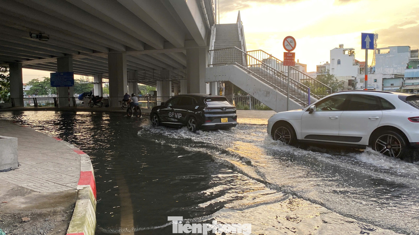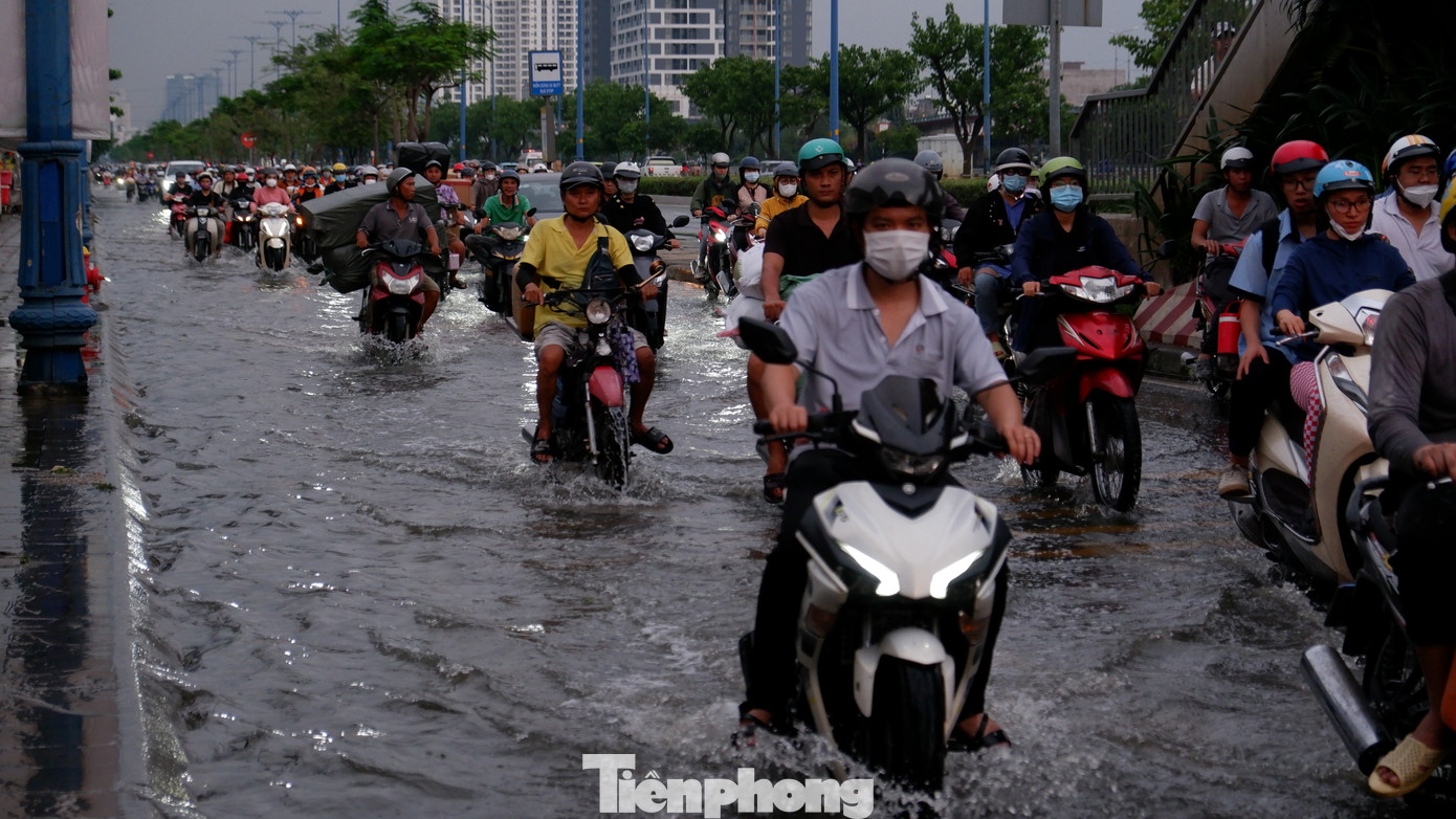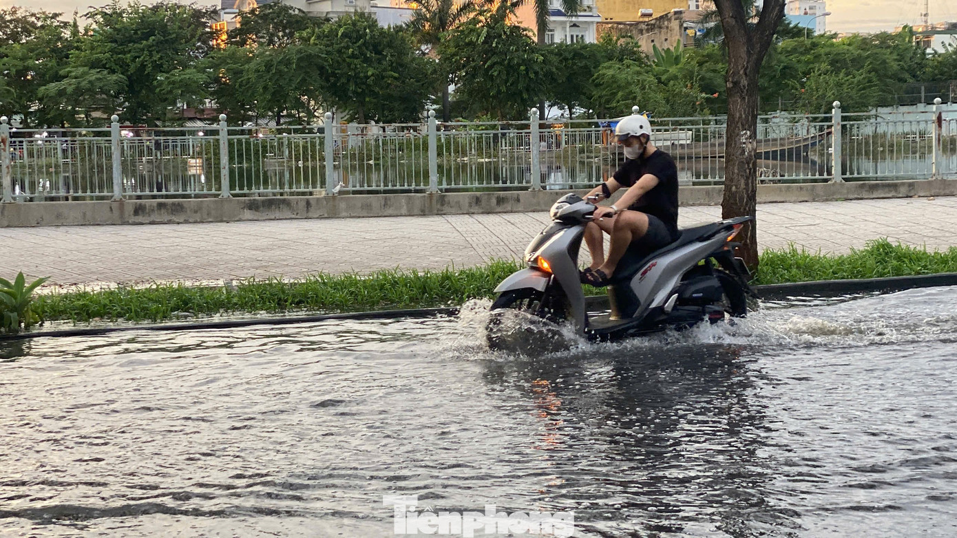 Đường Trần Xuân Soạn (phường Tân Thuận) tiếp tục ngập trong ngày thứ hai của đợt triều cường.