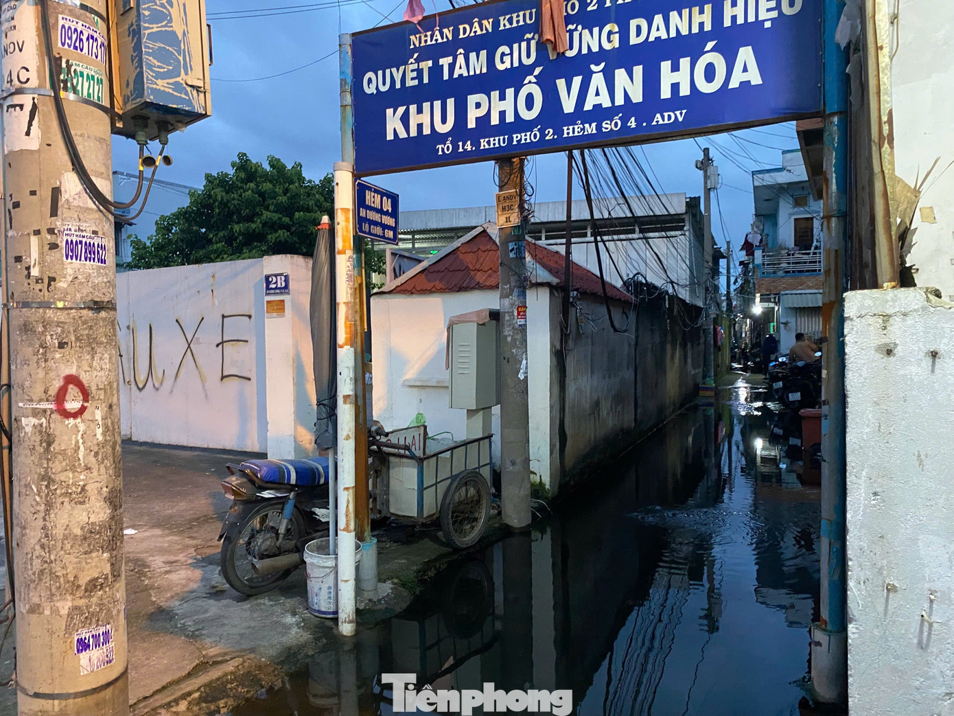 Nước từ miệng cống tràn lên gây ngập tại một con hẻm đường An Dương Vương, phường Phú Định.
