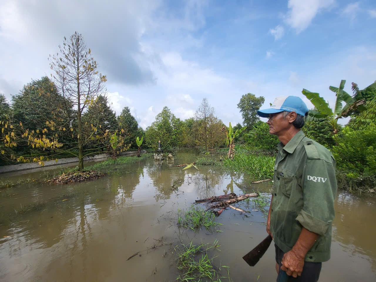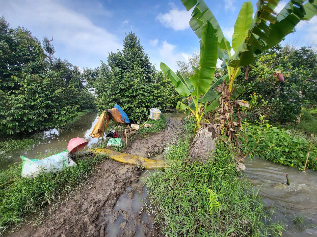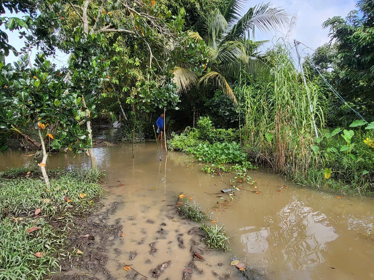 Cùng cảnh ngộ, vườn sầu riêng của ông Nguyễn Hữu Giàu ở cạnh tuyến Lộ Vòng Cung (Tỉnh lộ 923) cũng “thất thủ” trước những đợt triều cường dâng cao. Theo ông Giàu, con đường lâu nay vừa là tuyến giao thông huyết mạch, vừa như tuyến đê bao vững chắc bảo vệ nhiều vườn cây ăn trái của bà con, nhưng năm nay cũng không giữ nổi.