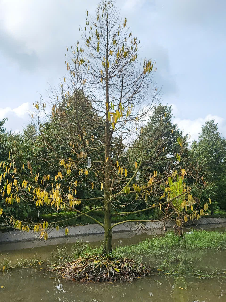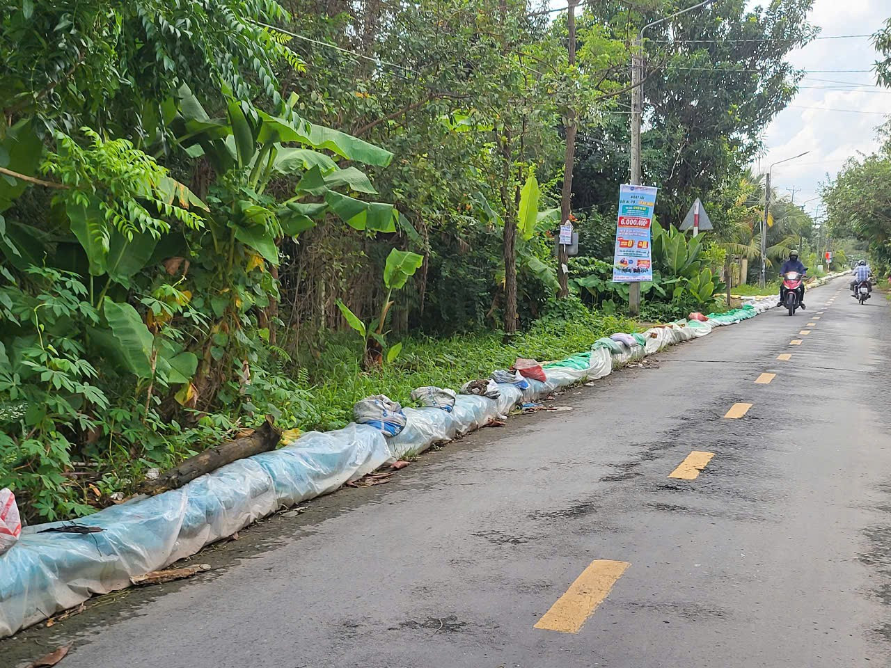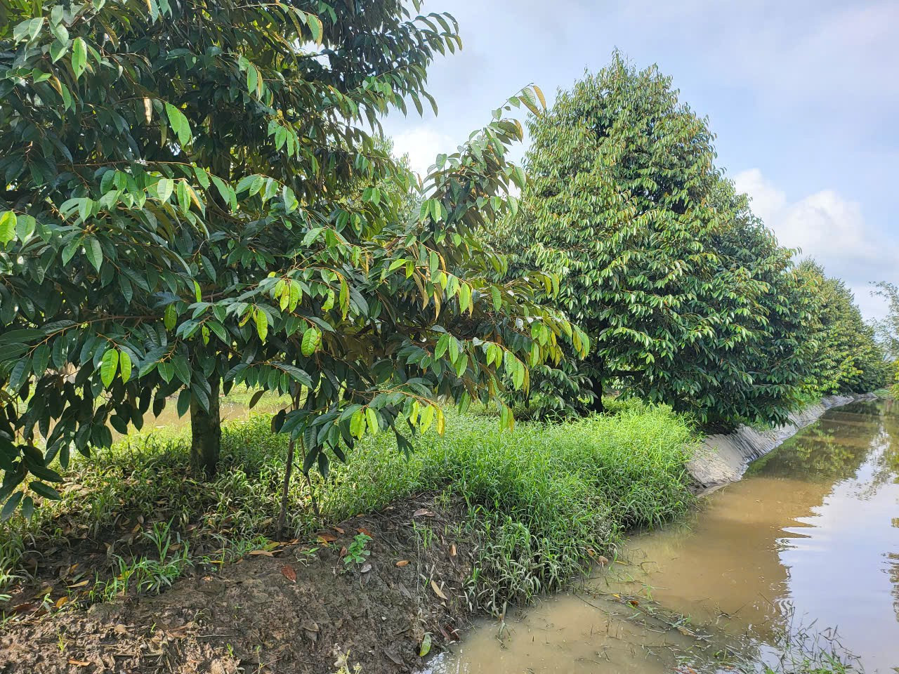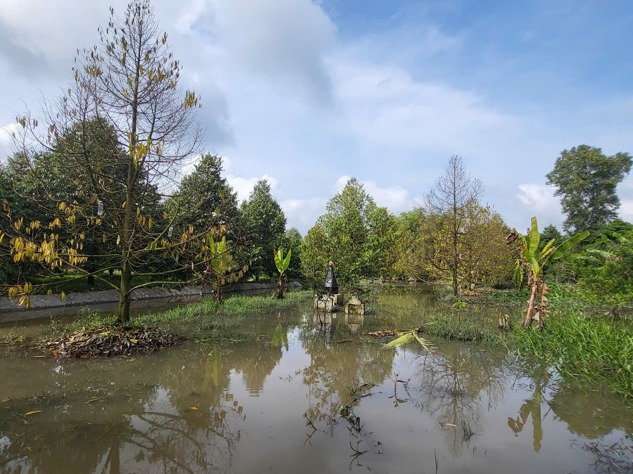 Cùng cảnh ngộ, vườn sầu riêng của ông Nguyễn Hữu Giàu ở cạnh tuyến Lộ Vòng Cung (Tỉnh lộ 923) cũng “thất thủ” trước những đợt triều cường dâng cao. Theo ông Giàu, con đường lâu nay vừa là tuyến giao thông huyết mạch, vừa như tuyến đê bao vững chắc bảo vệ nhiều vườn cây ăn trái của bà con, nhưng năm nay cũng không giữ nổi.