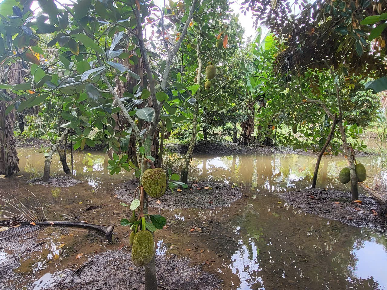 Không chỉ sầu riêng, nhiều diện tích trồng mít cũng bị ngập trong nước do triều cường.