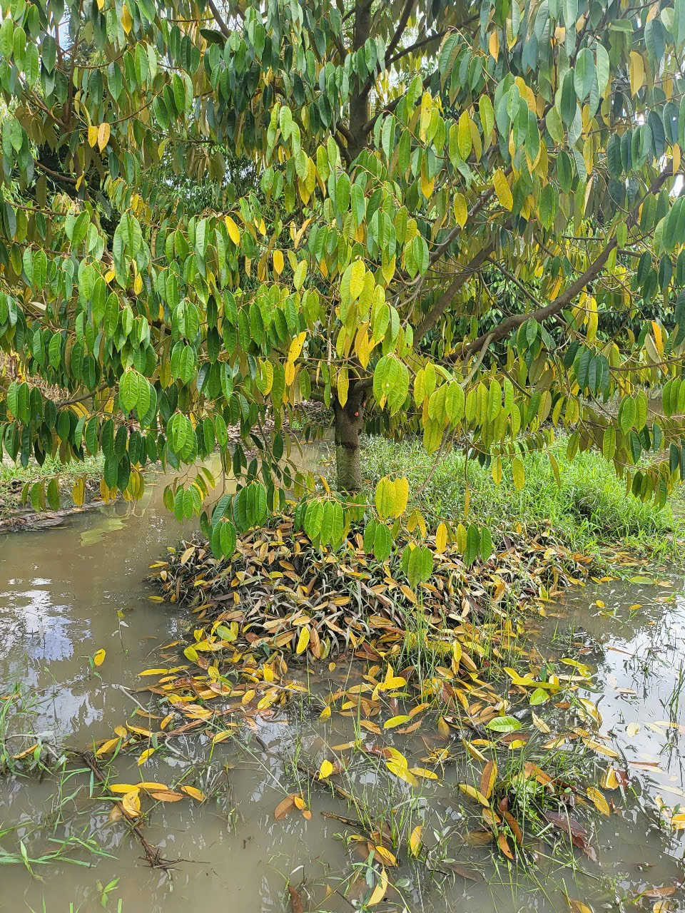 Nước ngập, cây sầu riêng bắt đầu chết. Theo tính toán của nhà vườn, mỗi cây sầu riêng phải trồng, chăm sóc mất hơn 4 năm mới cho trái, nếu cây chết sẽ thiệt hại nặng nề.