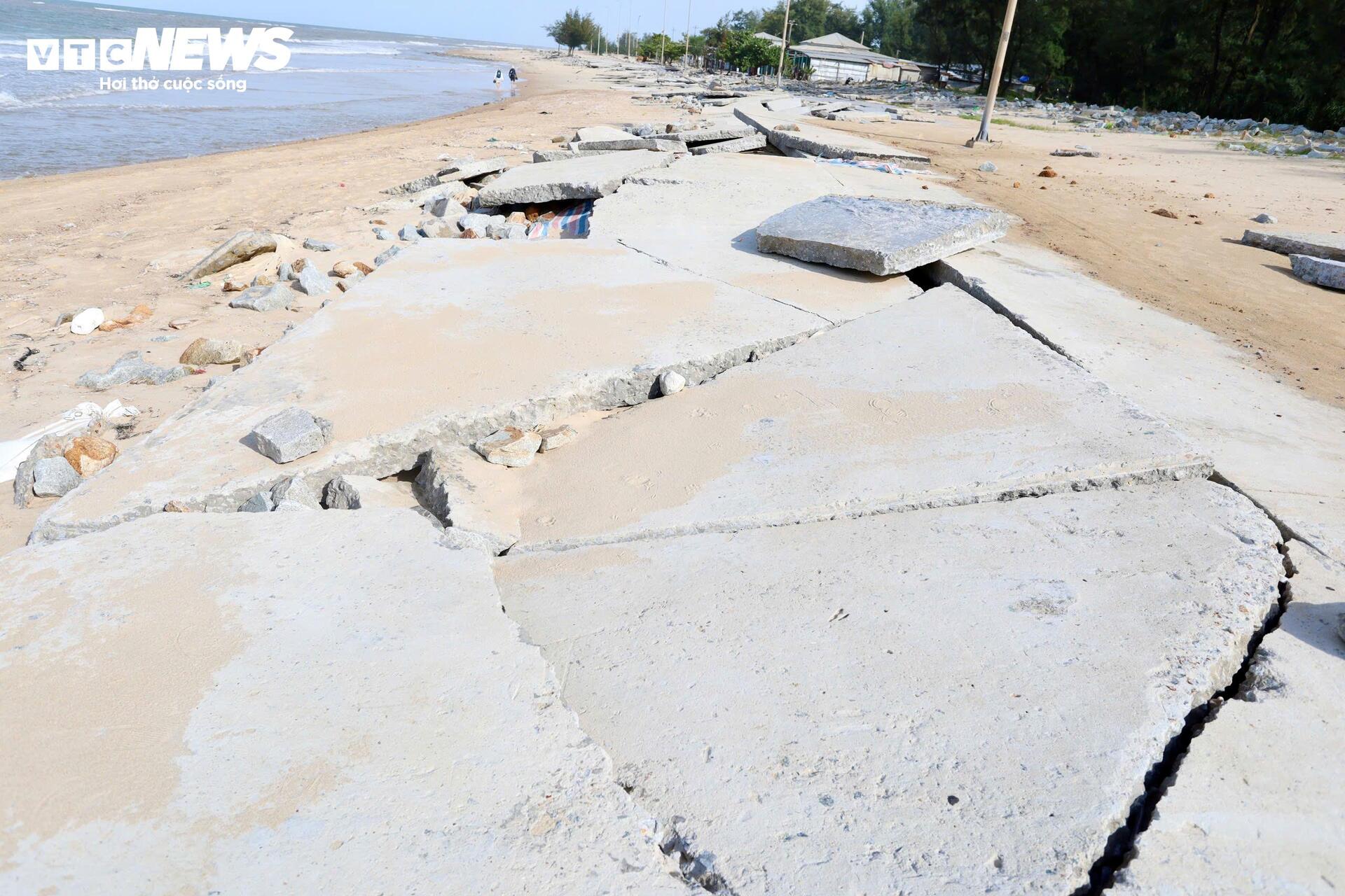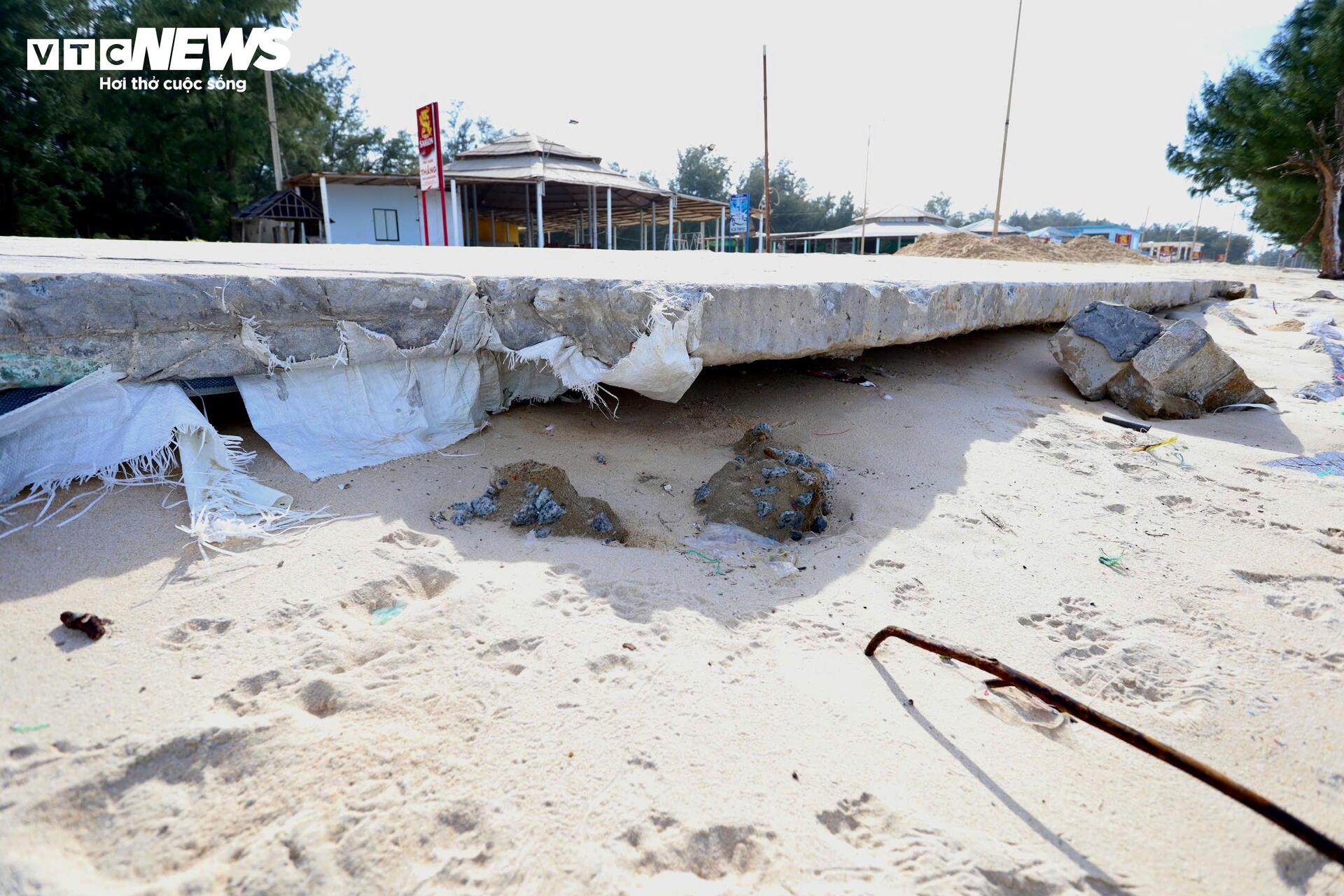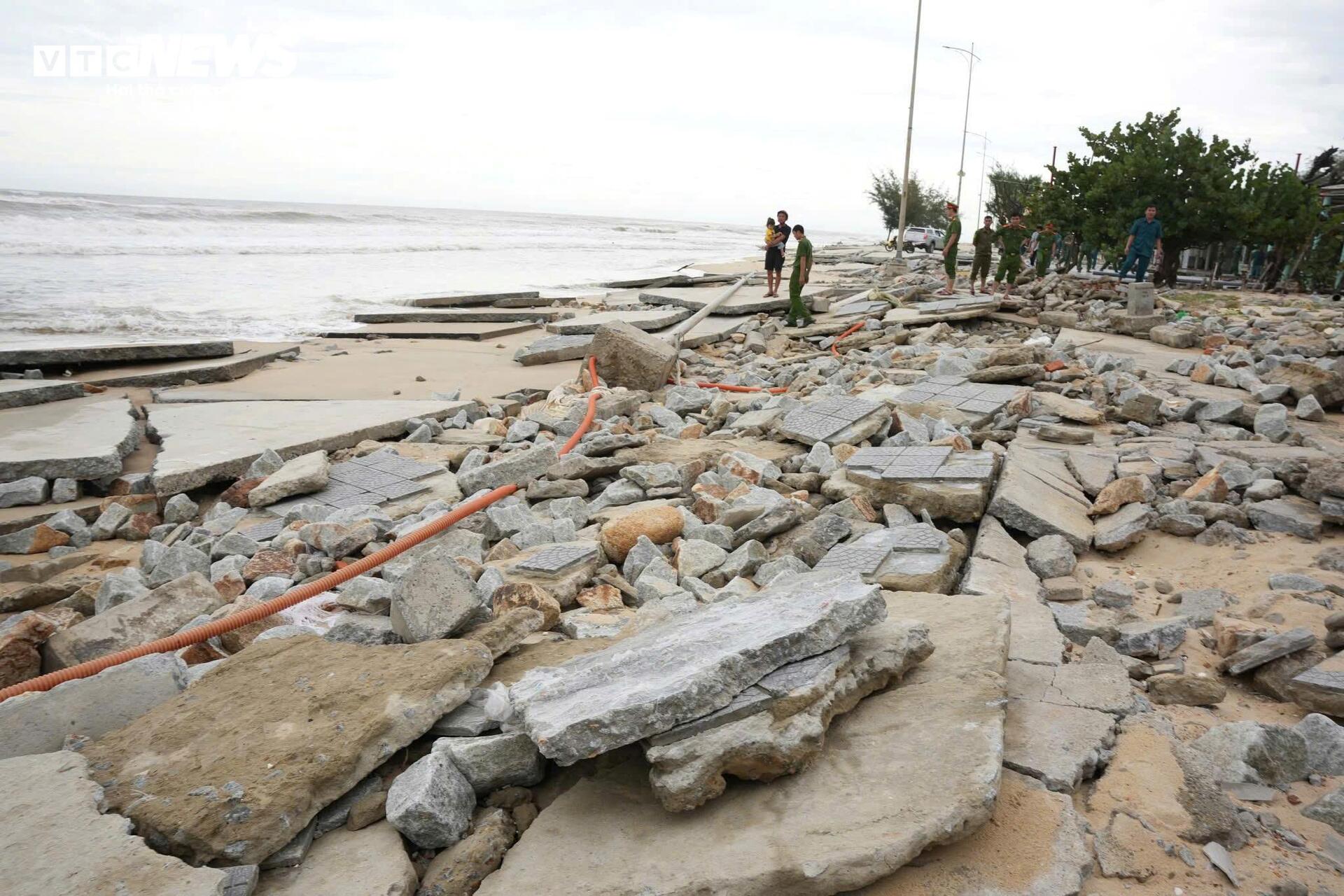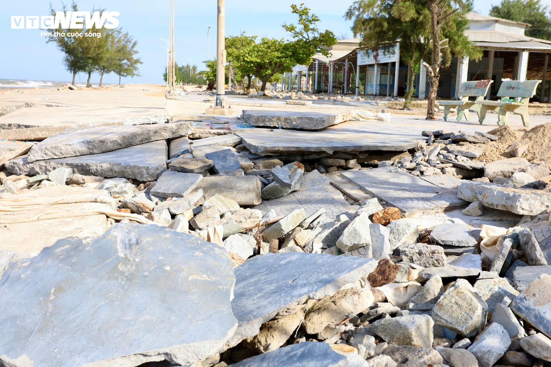 Sóng biển cuốn trôi bờ đá giữ cát, ăn sâu vào đất liền, kéo theo sự sụp đổ của những tấm bê tông lát đường và vỉa hè. Nhiều vị trí đường dạo bộ bị khoét sâu, tạo thành hầm hố nguy hiểm.