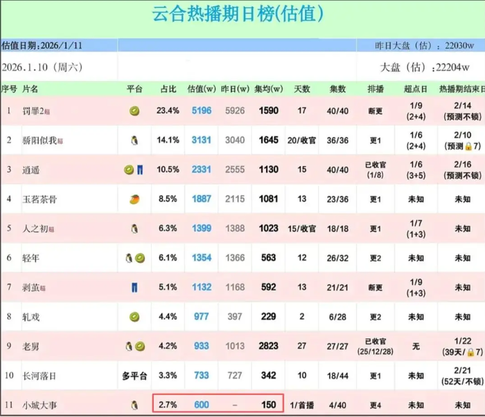 Bảng xếp hạng nhiệt độ phát sóng theo dữ liệu Vân Hợp (Yunhe) cho thấy Tiểu Thành Đại Sự có tỷ lệ chiếm thị phần thấp so với các phim cùng thời điểm