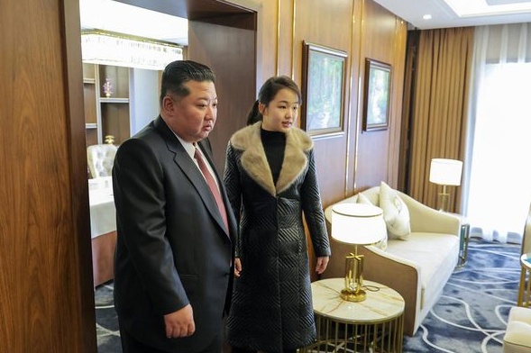 Lãnh đạo Triều Tiên Kim Jong-un (bên trái) và con gái Ju-ae tham quan hai khách sạn Ikkal và Milyong mới xây dựng ở Samjiyon, một thành phố phía bắc gần núi Paektu, ngày 20/12. Ảnh: KCNA.