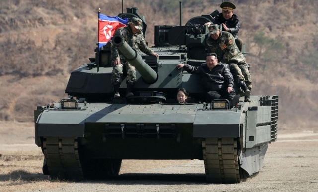 Nhà lãnh đạo Triều Tiên Kim Jong-un trên xe tăng thế hệ mới. (Nguồn: MW)