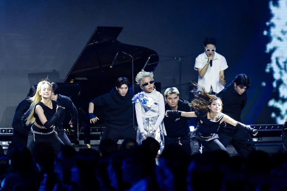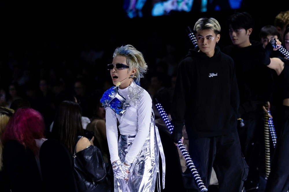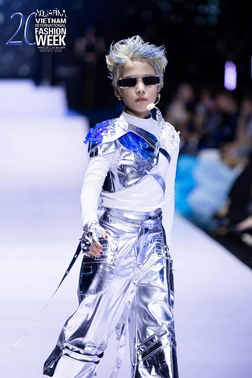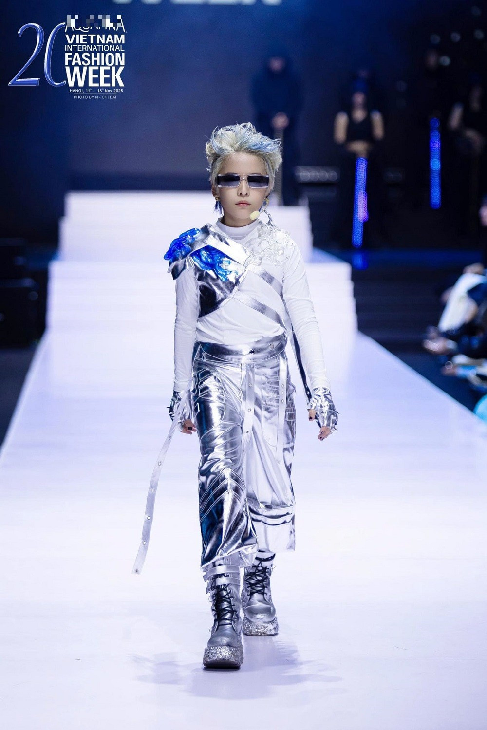 Gia Huy bước ra sân khấu với bộ trang phục ánh bạc, cấu trúc futuristic, mái tóc bạch kim và phong thái tự tin “đậm chất idol Gen Alpha”.