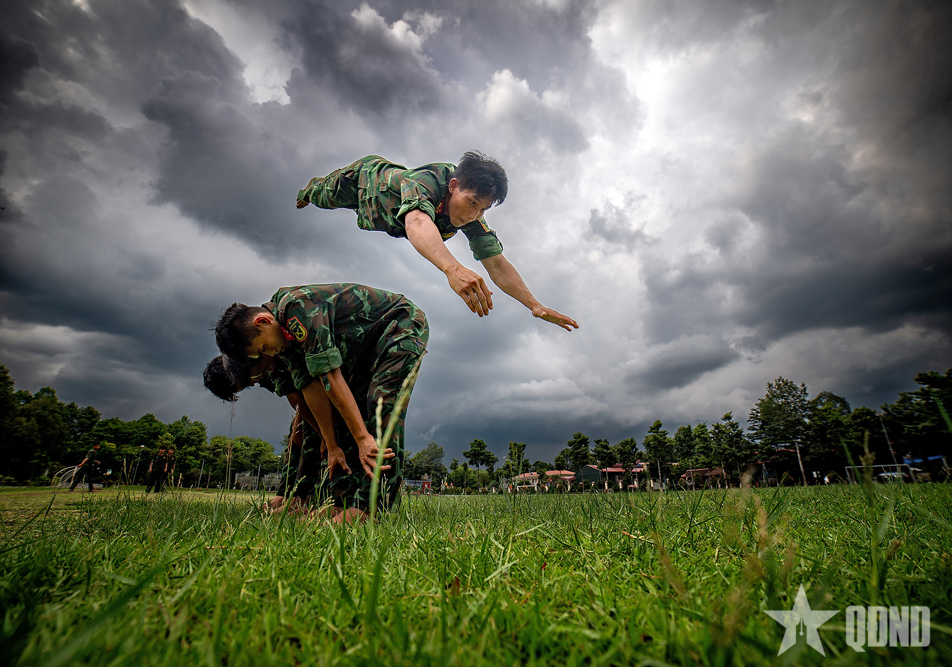 Lính trinh sát luyện tập bài tập bổ trợ “lộn mèo”.