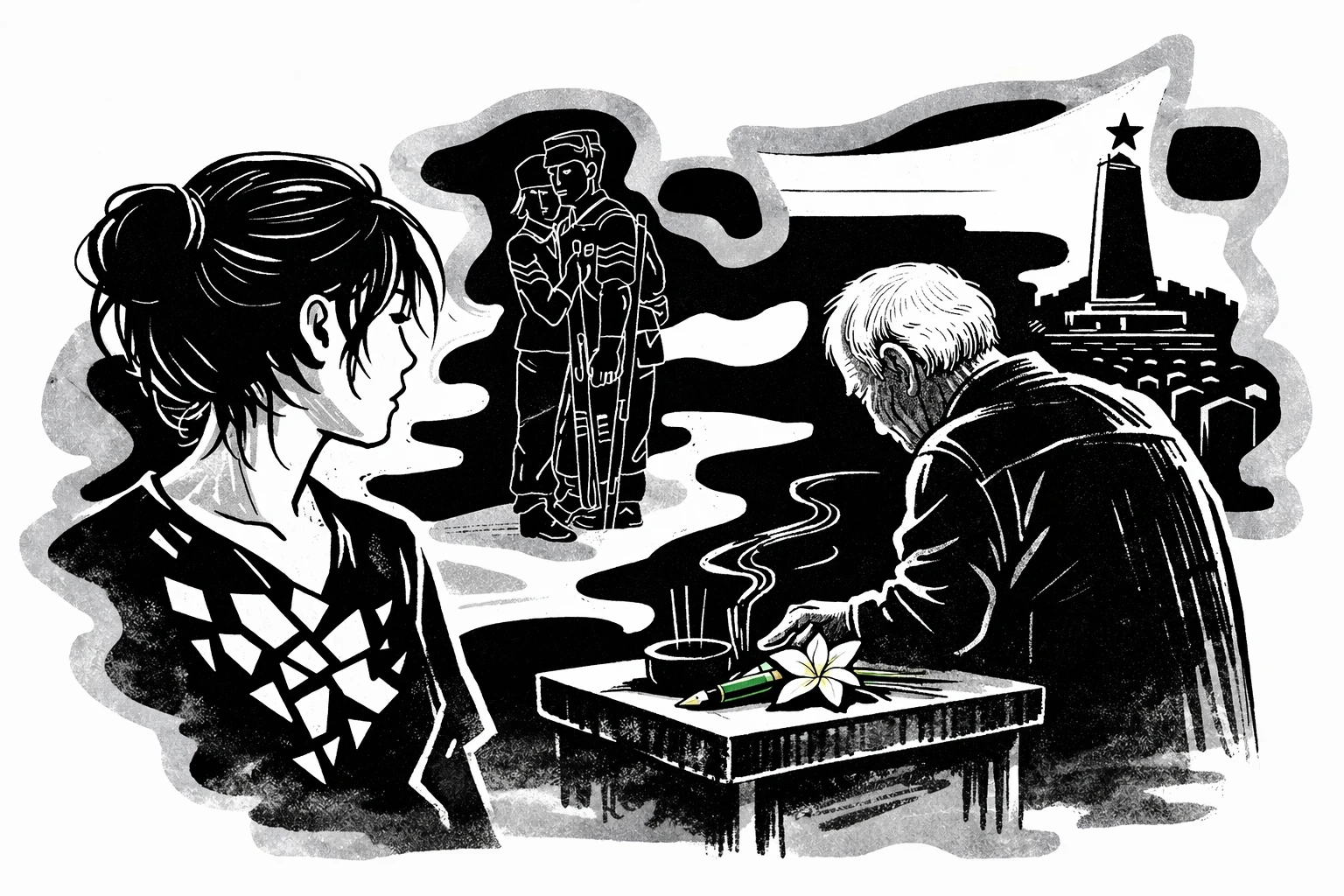 Sáng hôm sau, tại nghĩa trang liệt sĩ, giữa hàng ngàn nấm mộ ngay ngắn như một đội quân đang nghỉ ngơi, Thảo lặng người nhìn ông ngoại khó nhọc tiến về đài tưởng niệm. Ông đặt cây bút máy lên đó cạnh nhành hoa trắng muốt. Mắt ông ươn ướt nhưng không có giọt lệ nào rơi. Những người lính già thường không khóc bằng mắt, họ khóc bằng nỗi đau lặn sâu vào những nếp nhăn dọc ngang trên trán.