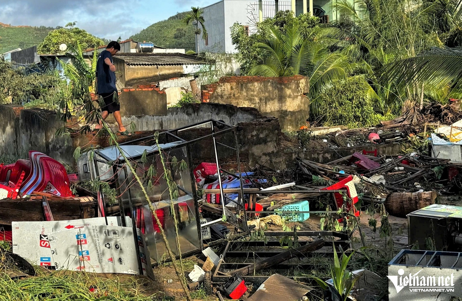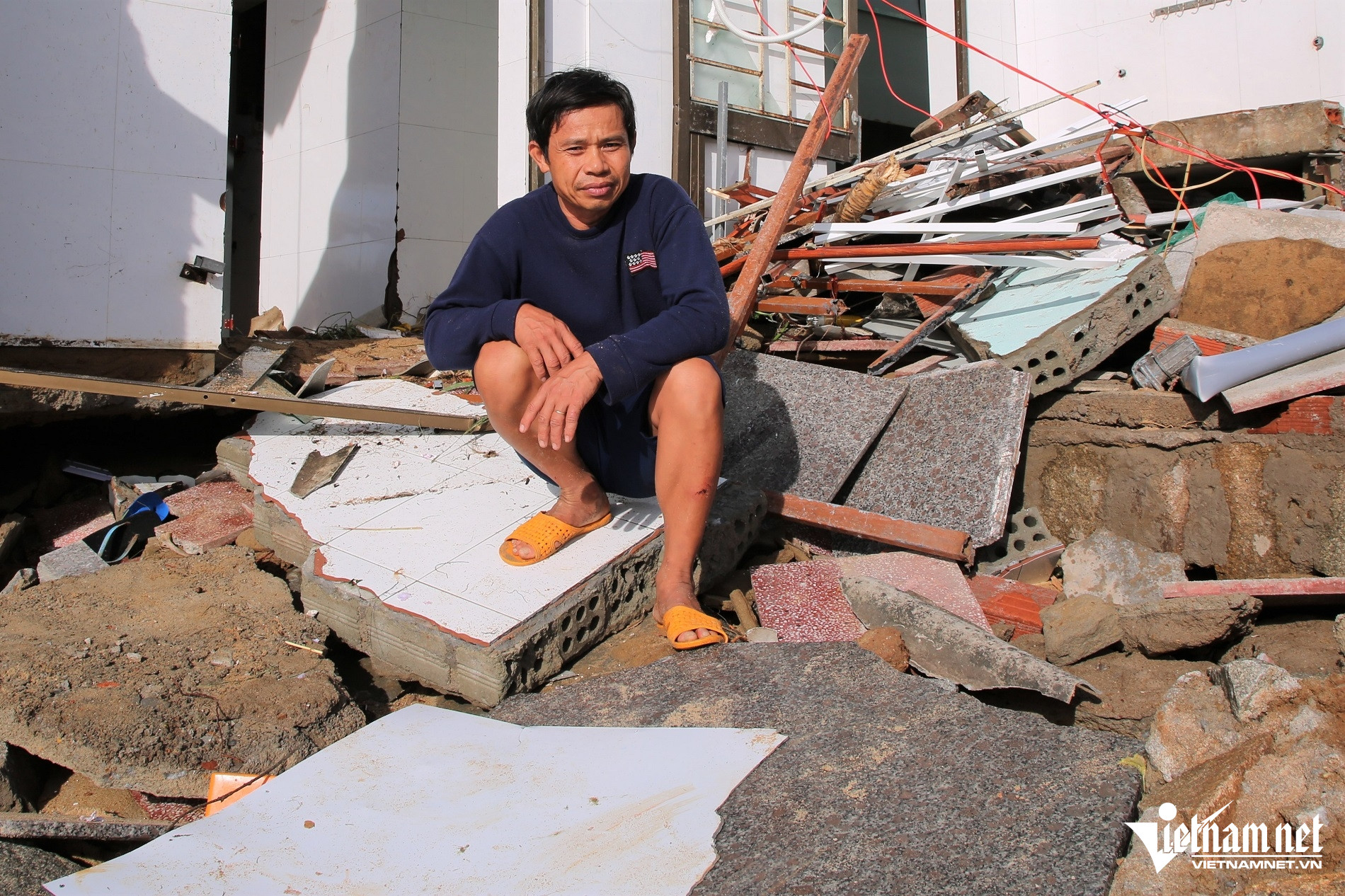 Cạnh đó, ông Nguyễn Sơn vừa dọn cát vừa thẫn thờ nhìn phần nền còn sót lại của căn nhà. “Tối qua tôi di tản, sáng về thấy nhà chỉ còn là đống gạch vụn. Sóng cuốn hết đồ đạc, chẳng còn gì để giữ lại”, ông thở dài.
