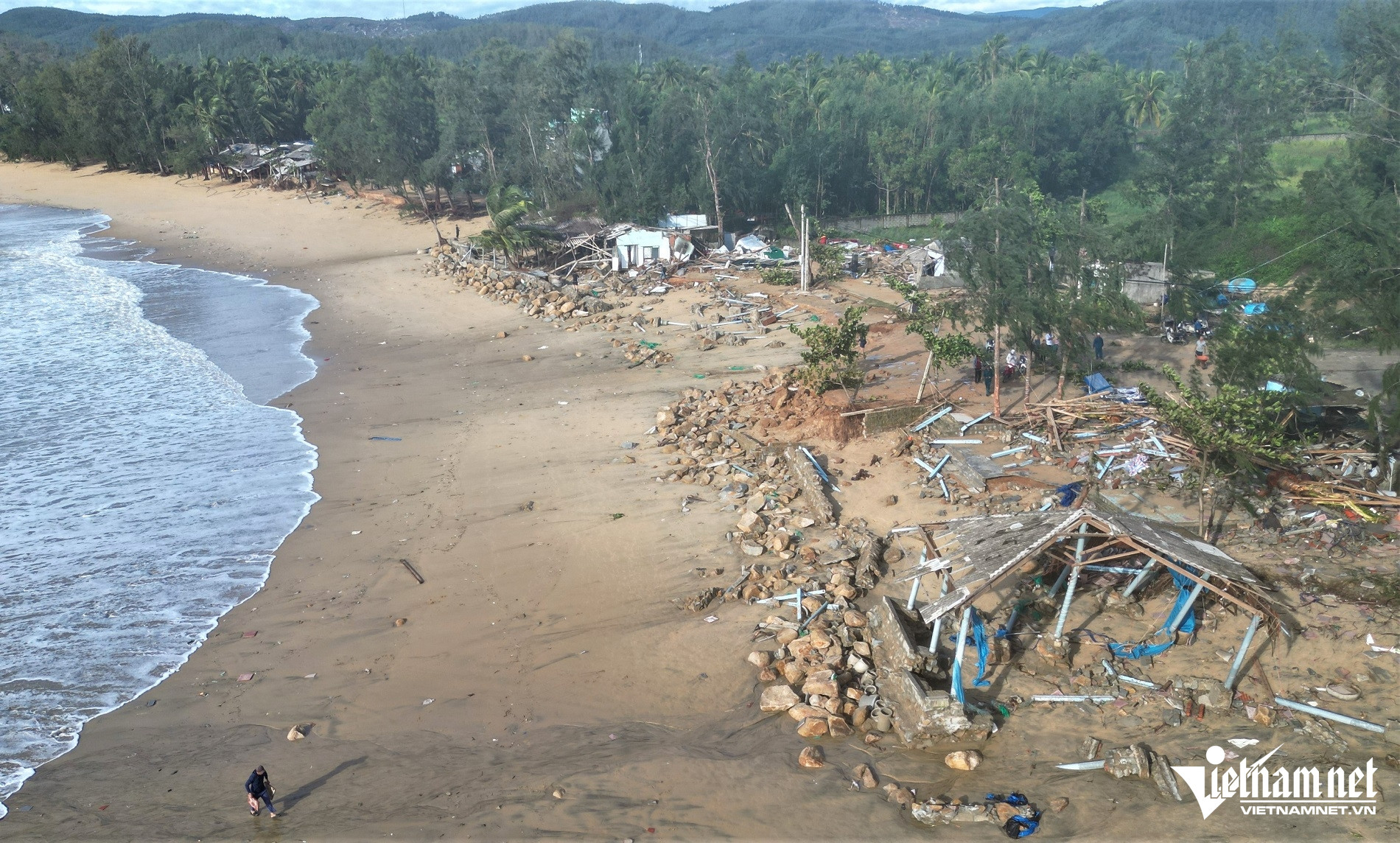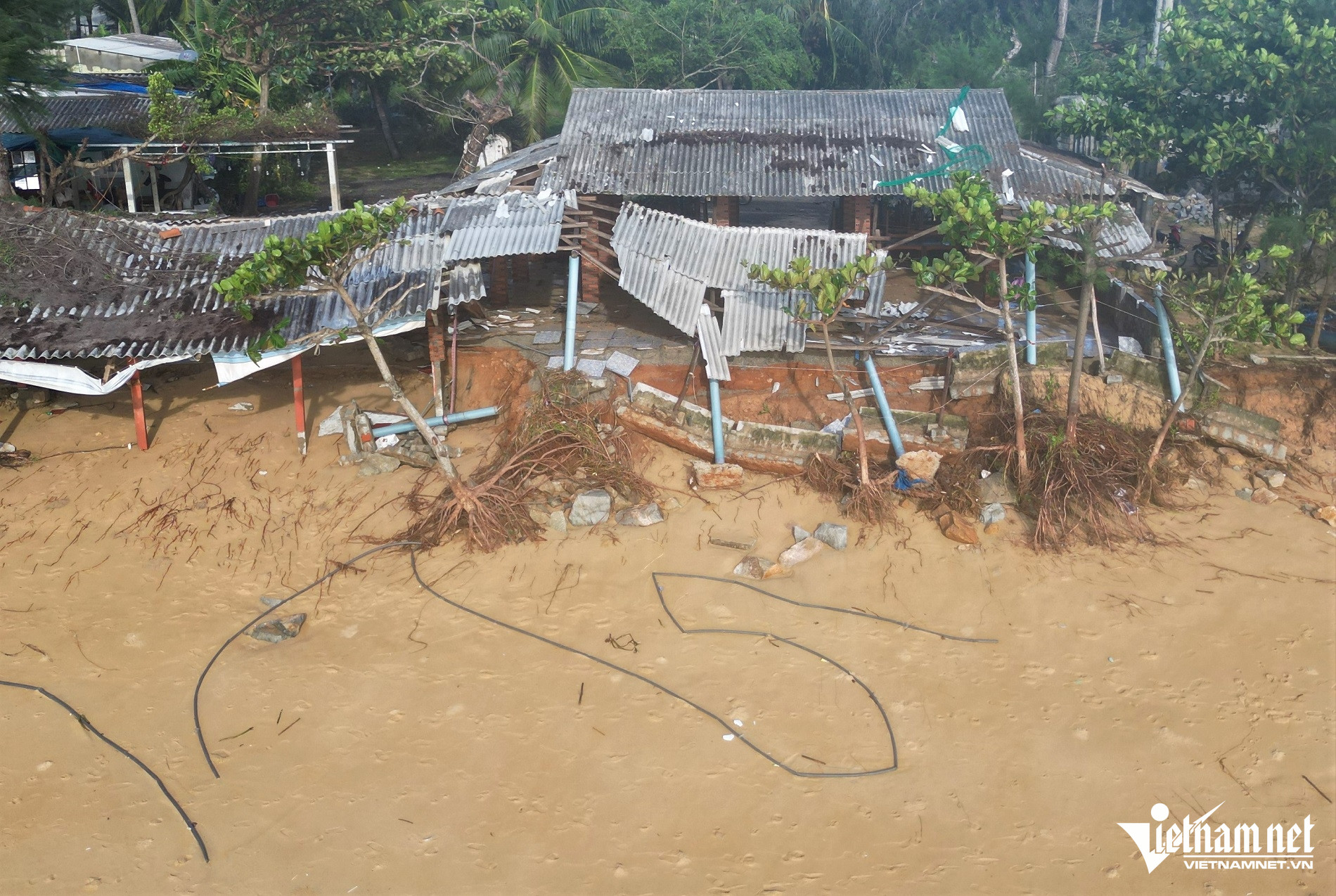 Sóng biển ngoạm vào sát vách hàng quán ven biển, để lại từng mảng bê tông vỡ, mái tôn cong vênh và những khoảng trống loang lổ nơi sóng vừa quét qua.